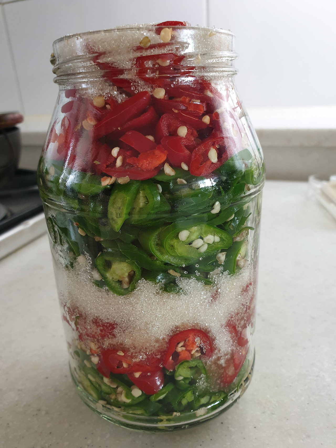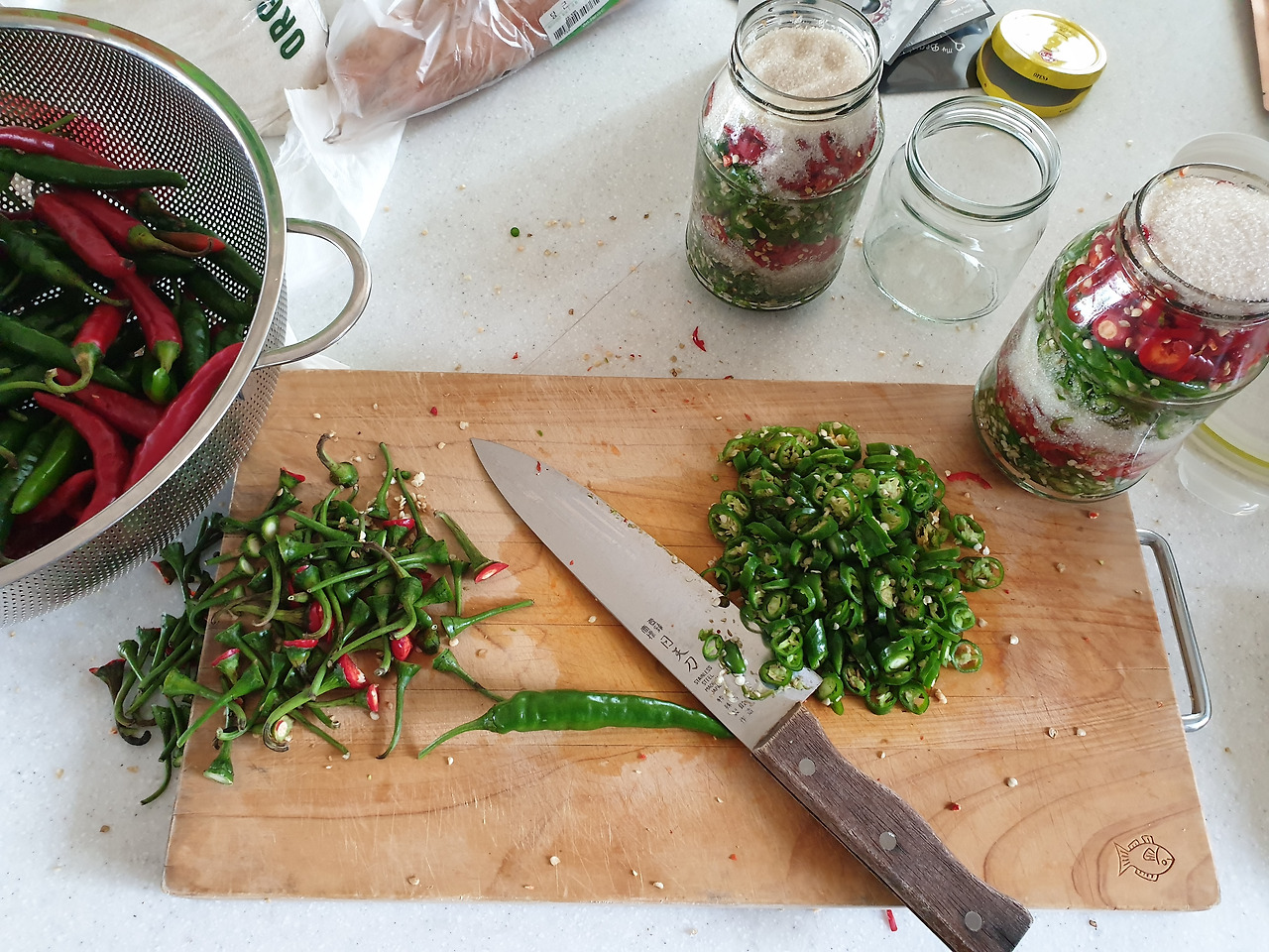 1년 동안 '담그는' 것들이다. 격년으로 담그는 애들도 있고 매년 빼먹지 않는 애들도 있지만, 난 늘 뭔가를 담근다. 오늘도 고추청을 담갔다. 청홍고추를 송송 썰고 층층이 놓은 뒤 설탕을 뿌려주면 끝.
