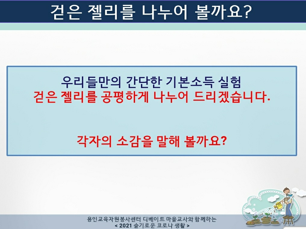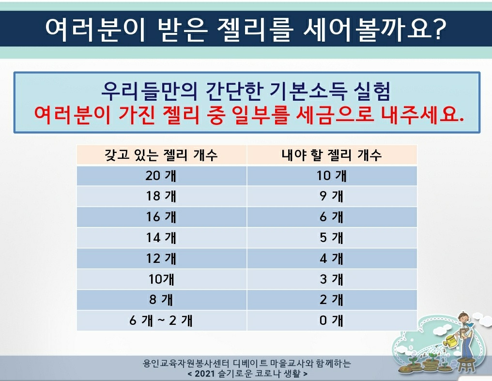 주어진 기준대로 일정 개수의 젤리를 세금으로 거두었다. 세금의 이유는? 여기서 '공유자산, 공유부'의 개념이 등장한다. 학생들이 젤리를 갖게 된 것, 누군가는 많은 수의 젤리를 갖게 된 것은 단순히 그 사람이 아주 뛰어났기 때문만은 아니라고 설명한다. 자연과 사회가 우리 인류에게 물려준 유산인 자연적 공유자산과 지식, 기술과 같은 인공적 공유자산이 있었기 때문에 개인의 수익 창출이 가능했다는 것이 기본소득제를 정당화하는 '공유자산'의 개념이다. 학교라는 공간, 마을교사들이 준비한 디베이트 수업이 있었기 때문에 젤리를 획득했으니 그에 맞는 세금을 내라는 것...