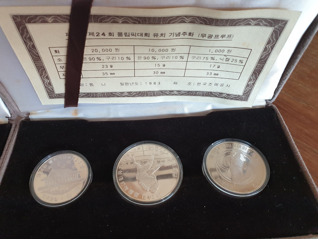 1983년에 발행된 1988년 올림픽 유치 기념주화, 올림픽 마스코트 배지 액자, 성화봉이 세트로 왔다. 국가적으로 영광스럽고 인상적인 역사의 기록물이니 버릴 일도, 팔 일도 없겠지만 두고두고 기다리면 가치가 올라가지 않을까.