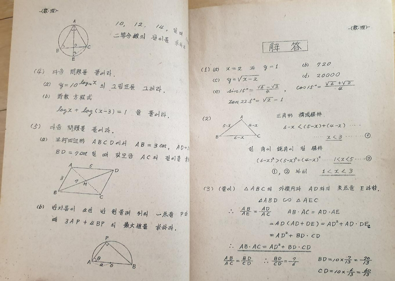 영어와 독어를 제외한 모든 과목은 한자를 모르면 풀 수 없었다. 작은 아이와 나는 머리를 맞대고 암호를 해독하듯 수학 문제를 읽어 내려갔다. 방정식, 삼각함수 등의 한자를 읽어내는 것만으로도 버거운 시험이었다. 물론 당시의 고등학생들에게는 별 문제가 안 됐겠지만 말이다.