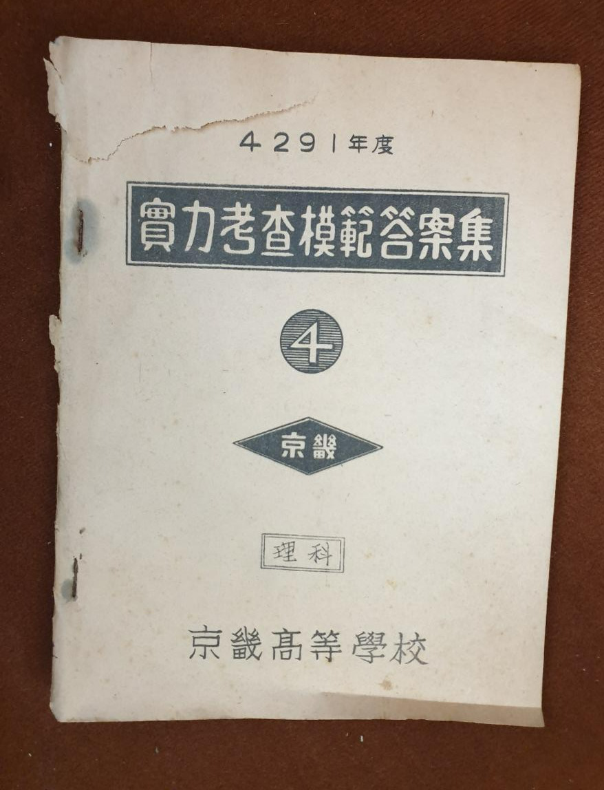 "실력고사모범답안집"이라고 쓰여있는 작은 책자에는 1958년 이과 시험문제와 해답이 실려있었다.