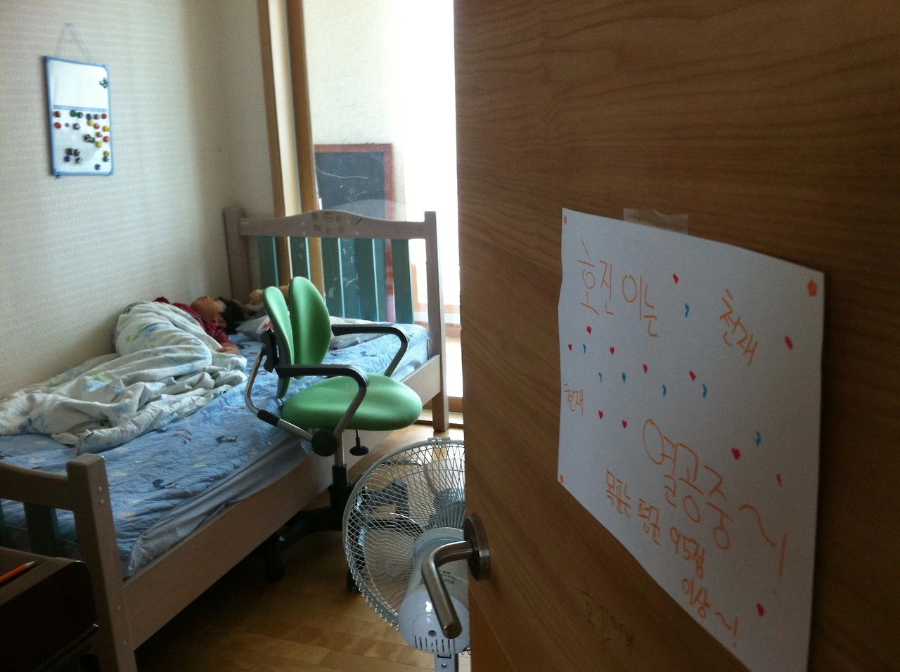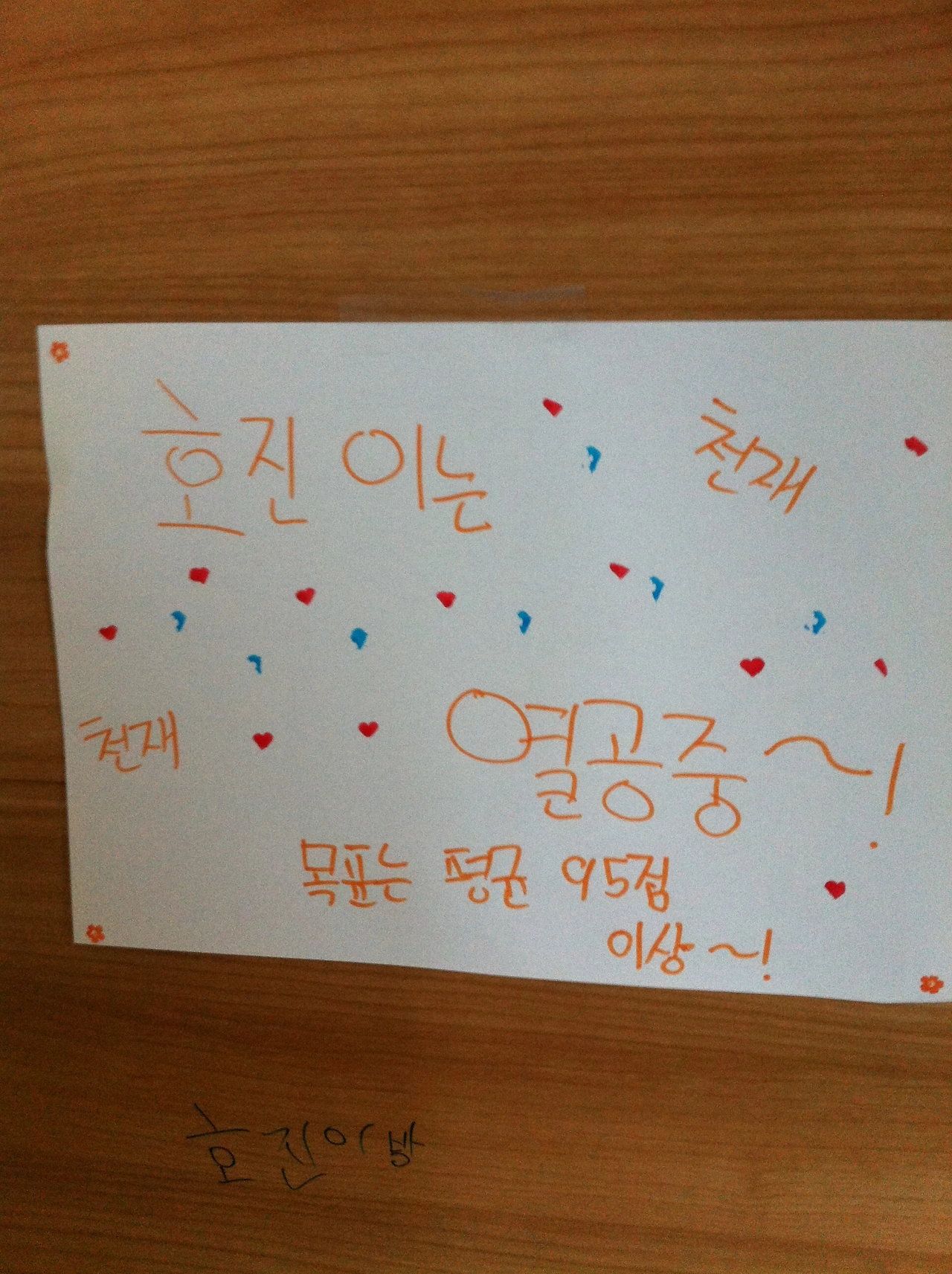 방문 앞에는 A4 용지에 '천재 이호진의 방'이라고 붙여놨다. 평균 95점 이상이라는 목표까지 써놓았지. 담임선생님이 학구열에 불타는 분이셔서였을까? 초등학교 2학년에 불과한 너희들이었는데, 1등부터 10등까지 일으켜서 칭찬해주었다는 이야기에 기함을 토했지.