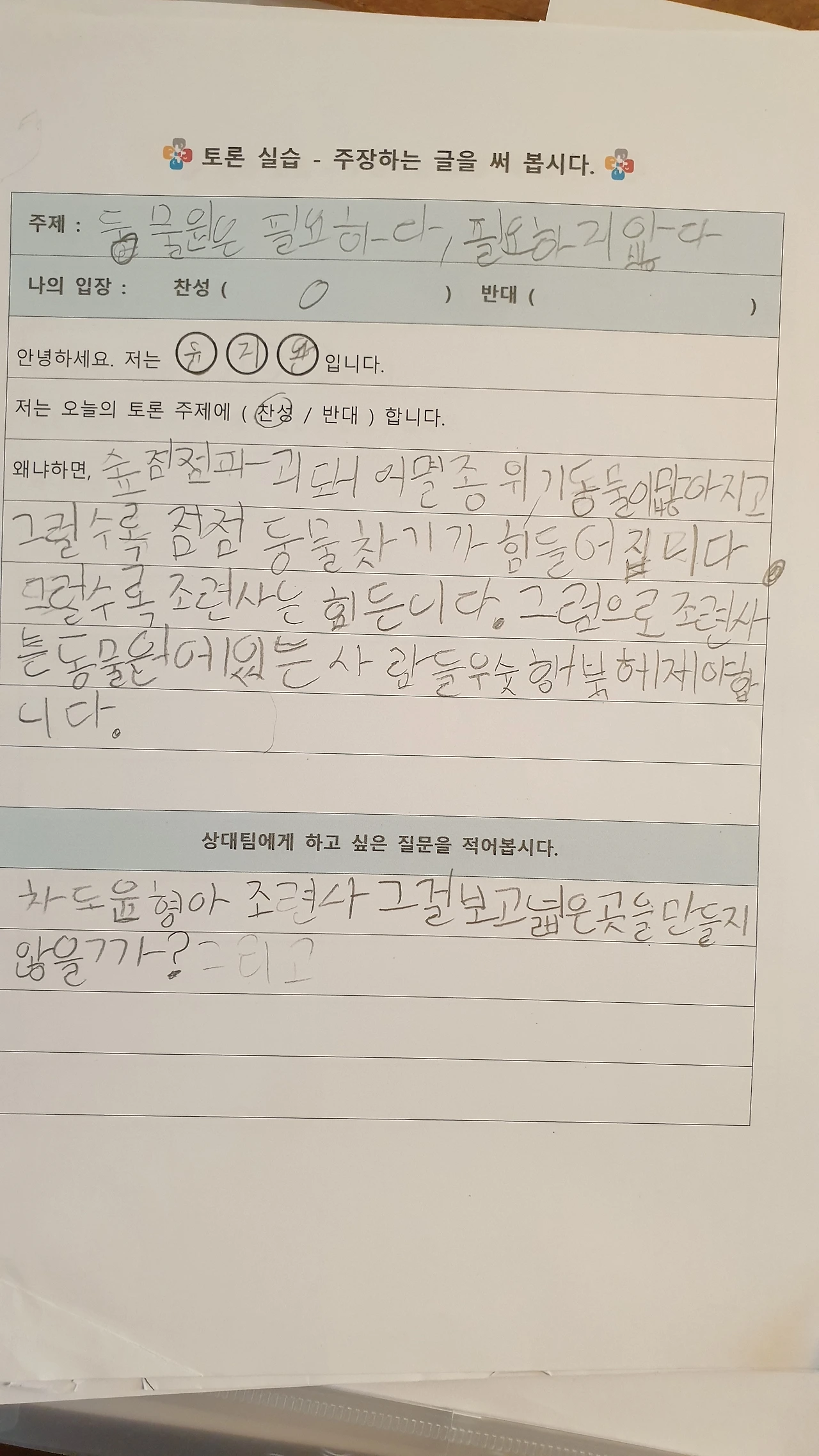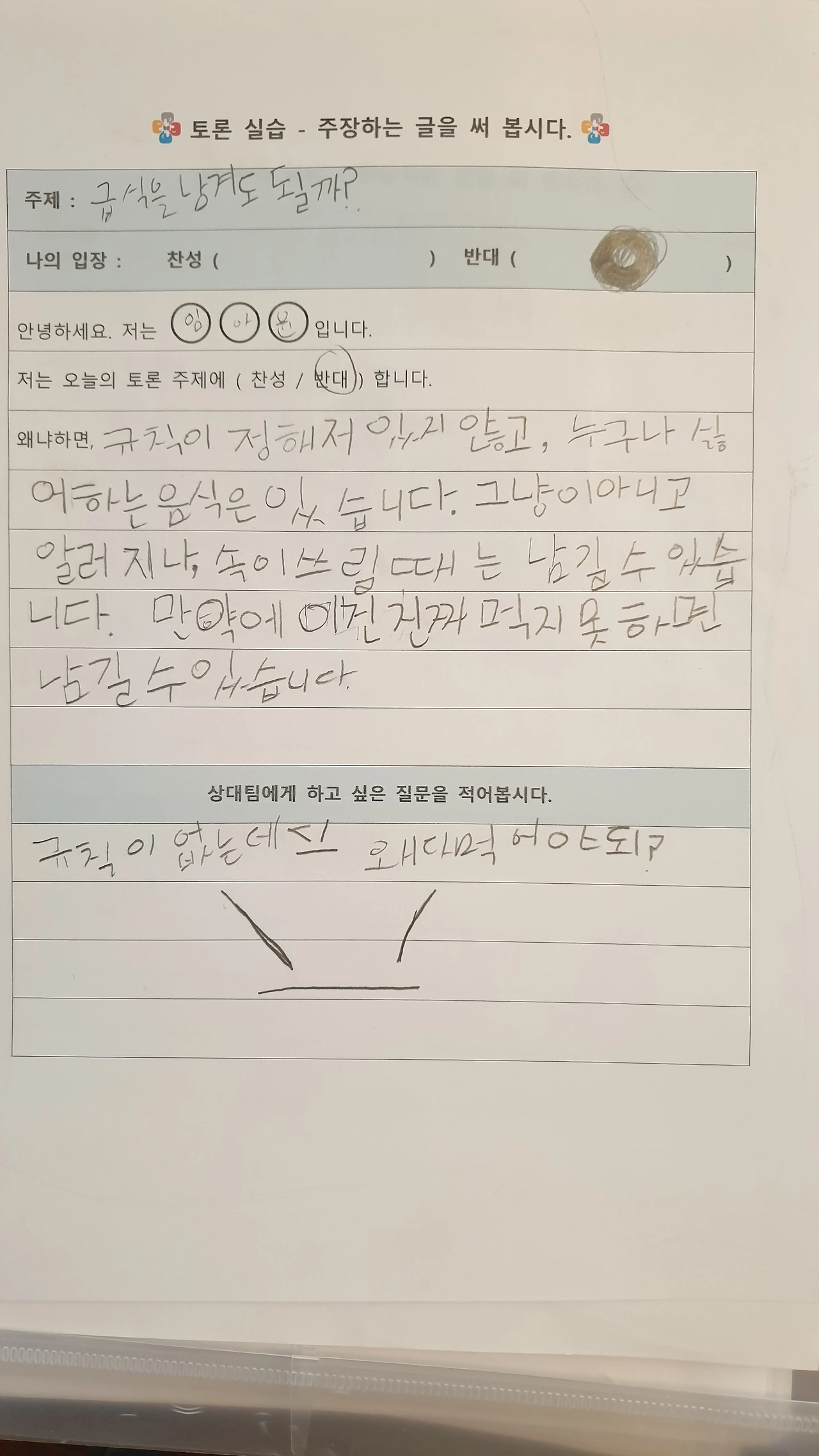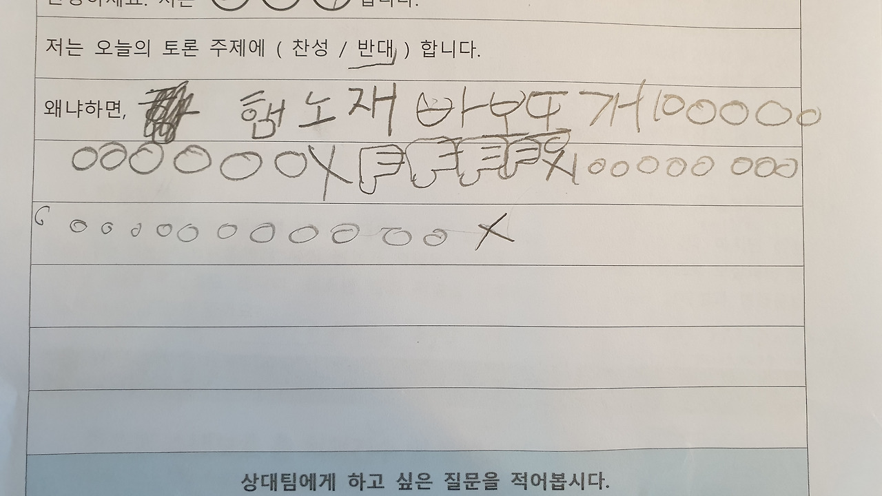 사각사각 연필 소리 사이로 "아... 난 찬성하기 싫은데... 반대로 옮기면 안 돼요?"라고 고집을 부리는 아이.