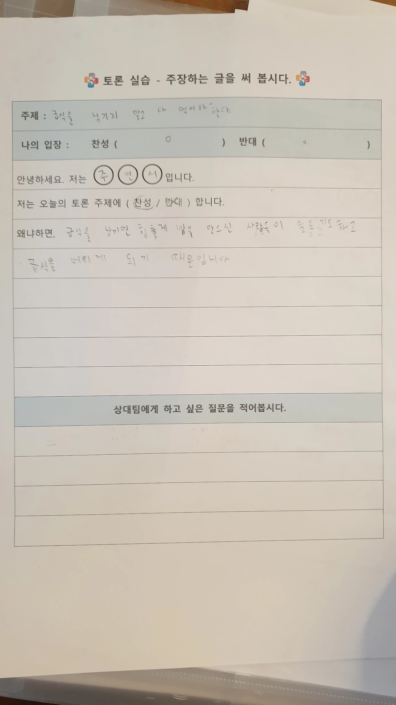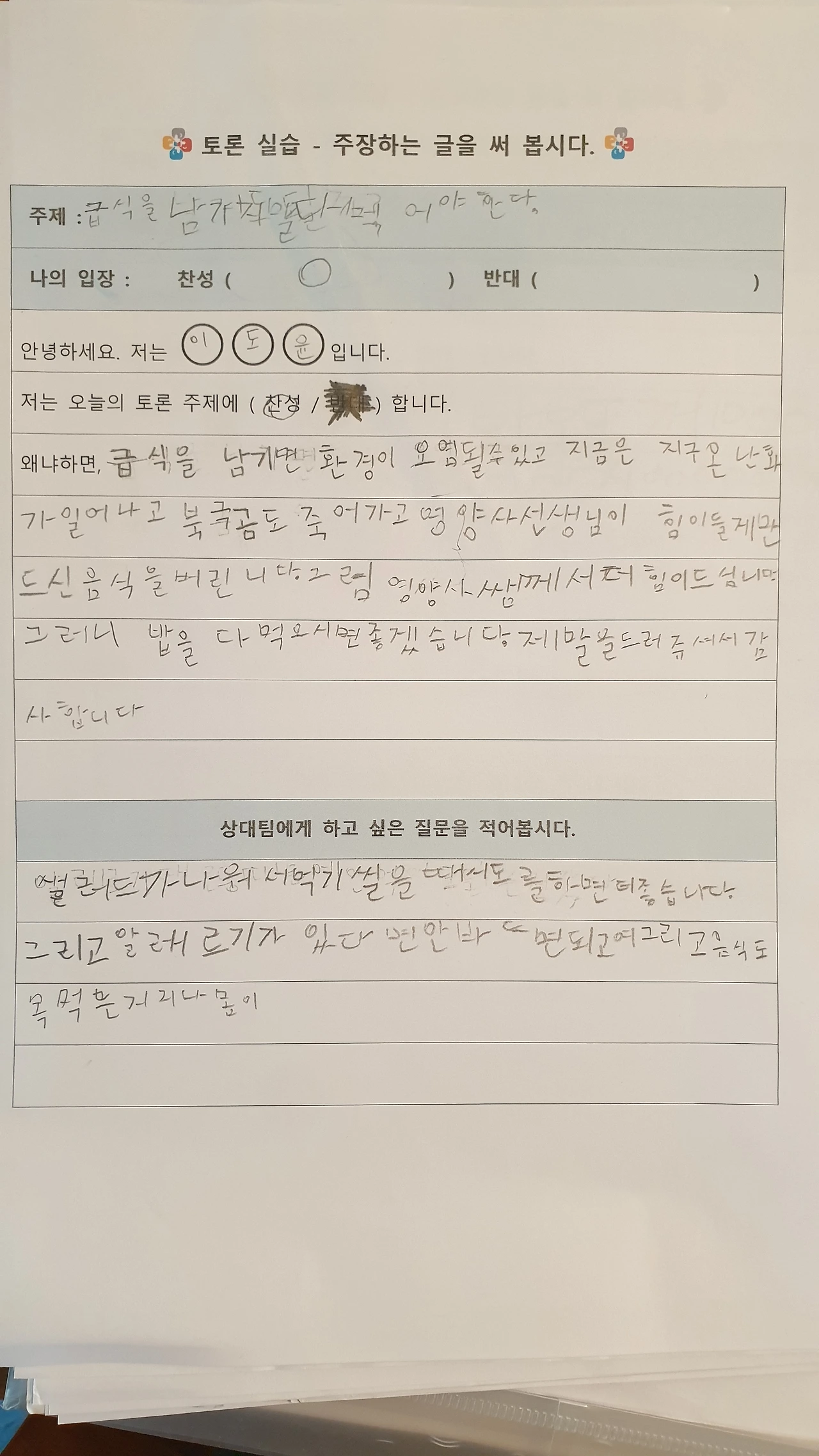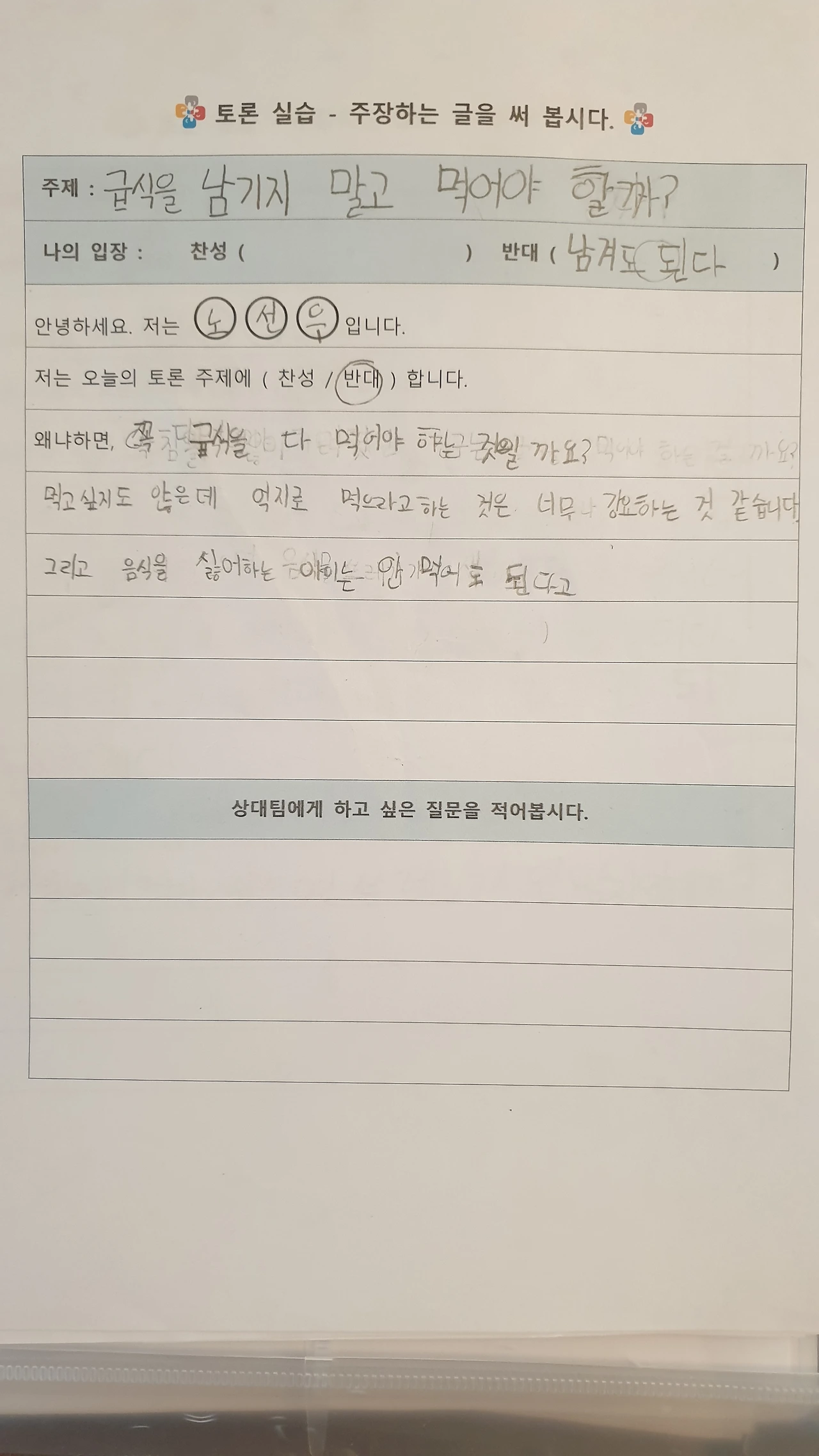 사각사각 연필 소리 사이로 "아... 난 찬성하기 싫은데... 반대로 옮기면 안 돼요?"라고 고집을 부리는 아이.