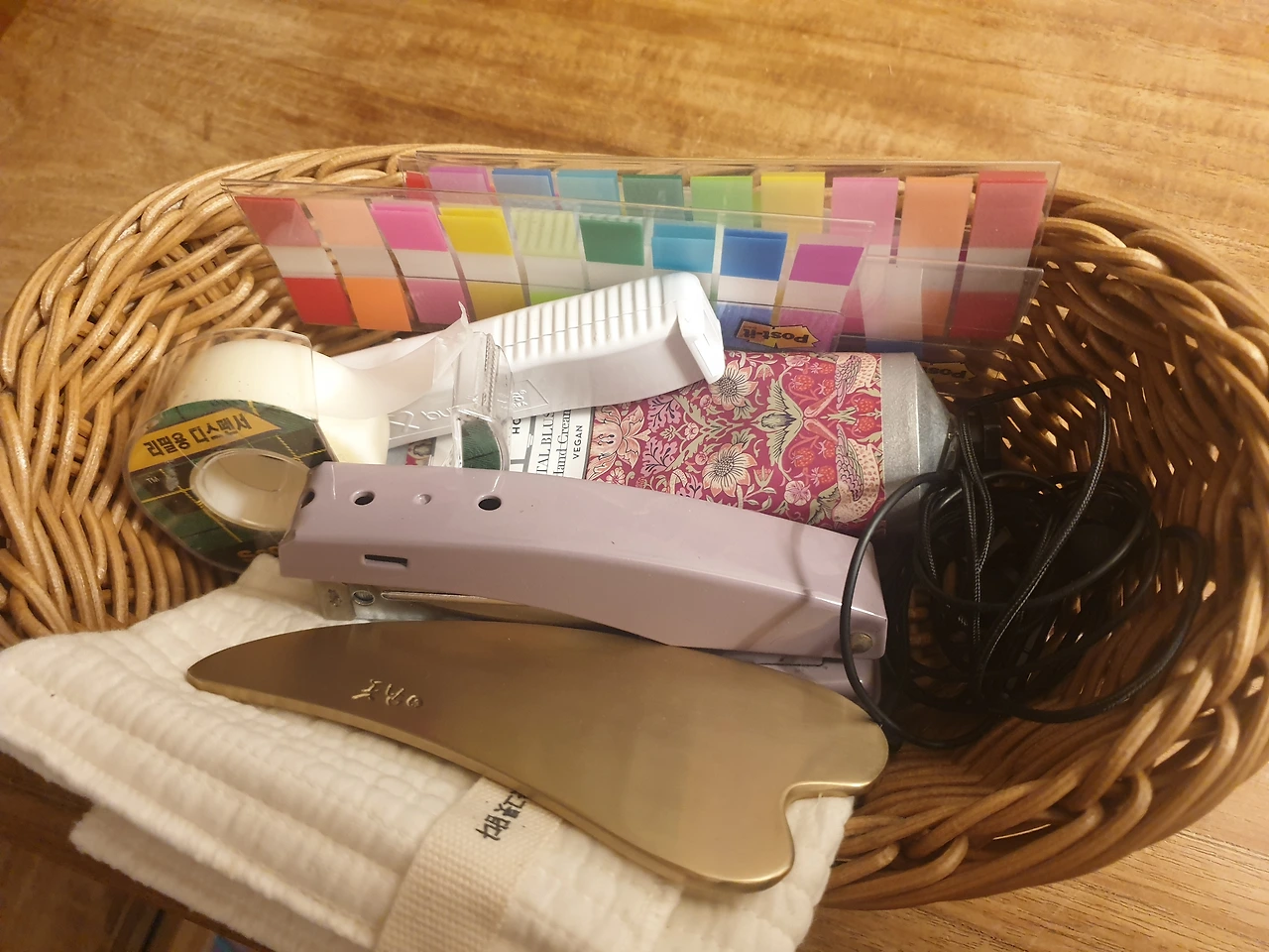 작고 아담한 내 사무실에는 일하는 데 필요한 모든 것이 정갈하게 자리 잡았다. 읽어야 하는 책, 읽고 싶은 책이 얌전히 정리되어 있고, 수업에 필요한 교재와 수업 기록지도 손 닿는 곳에 정렬해 있다. 자주 쓰는 외장하드 2개, 스테이플러, 책에 붙일 플래그 스티커, 뭉친 어깨를 부드럽게 마사지해 줄 괄사, 건조한 손을 촉촉하게 지켜줄 핸드크림, 갑작스러운 화상 회의에도 대처할 수 있는 립스틱까지 구비했다. 언제든 꺼내쓸 수 있도록 필기구가 들어있는 커다란 펜꽂이, 일정을 꼼꼼히 체크할 수 있는 주력까지.