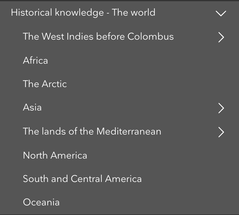 세번째 : 세계의 역사적 지식: 콜럼버스 이전 서인도, 아프리카, 극지방, 아시아, 지중해의 섬, 북미, 중남미, 오세아니아
