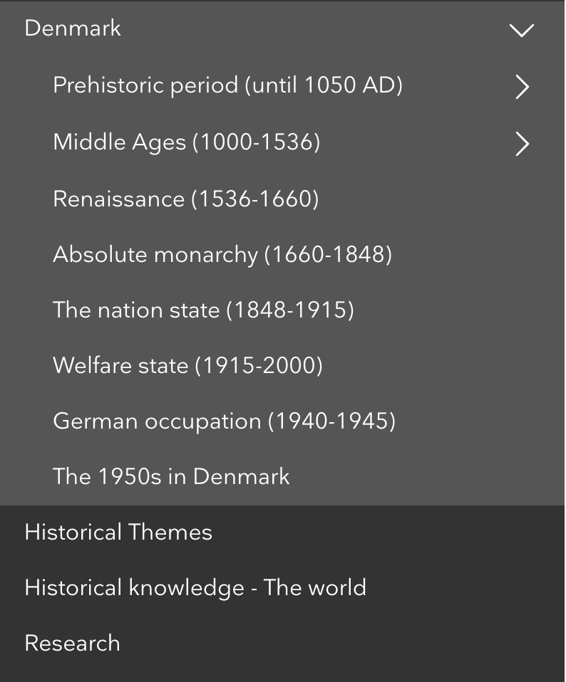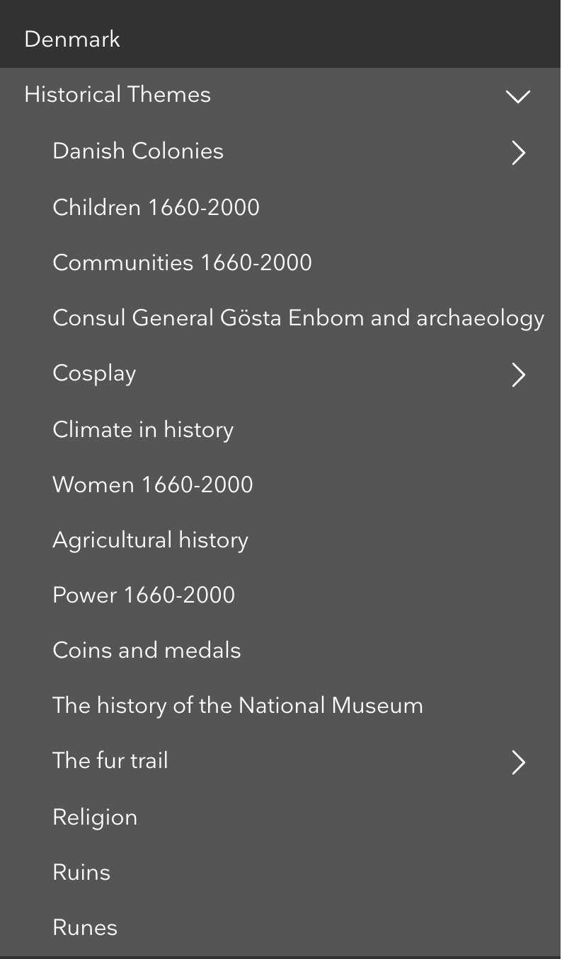 두번째: 역사적인 테마: 덴마크의 식민지, 1660-2000년의 아이들과 지역사회, 코스프레?? 역사에서의 기후변화, 1660-2000년의 여성들, 동전, 종교, 룬 문자