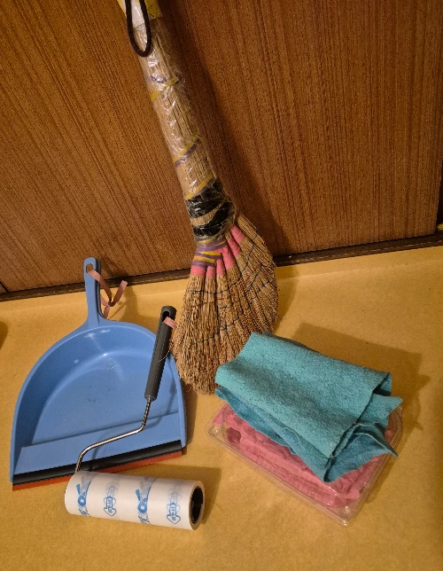 청소하는 93세 주변엔 몽당빗자루와 쓰레받기, 걸레, 돌돌이 또는 스티커가 있다. 이들은 93세의 친구다. 빗자루 몇 개를 새로 사주었지만, 손에 익지 않는다며 늘 낡은 것만 고집한다. 걸레는 부엌에 쓰던 행주가 낡으면 걸레가 된다. 이것 때문에 69세와 75세는 자주 헷갈린다. 행주와 걸레의 구분이 어렵다. 바닥에 있으면 걸레, 싱크대 위에 있으면 행주다. 쓰레받기 또한 한쪽이 떨어져 나갔지만, 다른 것은 맘에 안 드는지 오래된 것만 사용하고 있다.