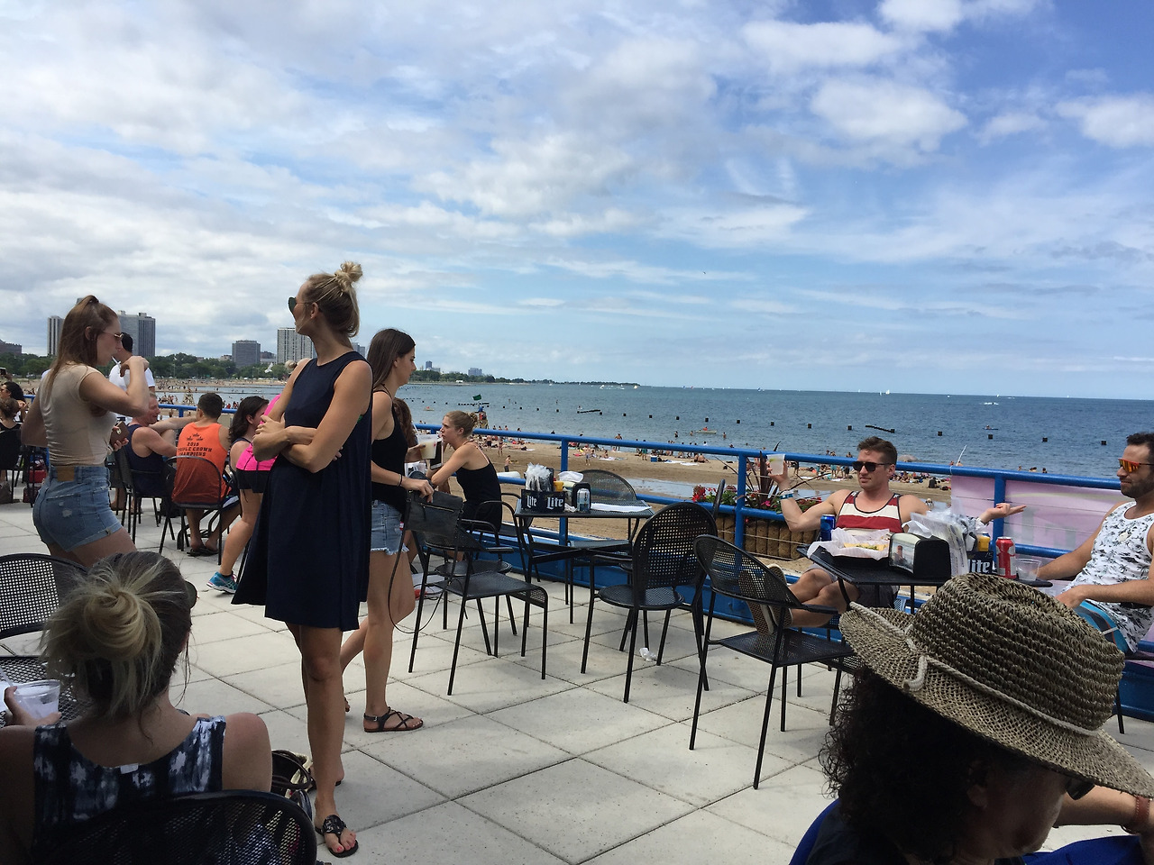 비치가 한눈에 보이는 쪽에 자리를 잡았다. 뒤쪽에는 존 행콕을 필두로 한 타운 스카이라인이 고스란히 놓여있다. 날 너무 좋았다. 해 쨍쨍. 이것저것 다 잊기는 최고. 훌러덩 벗은 남녀, 한쪽엔 한 무리 사람들 DJ 흥과 함께 춤추는 공간도 있고. 결혼식 앞둔 신부 친구들 파티도 몇몇 함께 하는 듯. 넓게 펼쳐진 미시간 호수, 오른쪽 그림처럼 펼쳐진 시카고 다운타운. 그리고 저쪽 방파제. 햄버거, 매운 양념 버무려진 프렌치 푸라이, 그리고 맥주. 무엇보다 '무료 와이파이'.^^ 이것저것 볼거리들. 미쿡미쿡스런 곳 요즘 필요했는데, 딱 제 타임에 적격의 출타.
