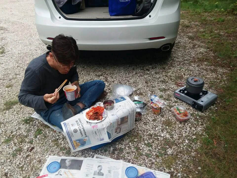 그리고 화제가 된 일명 '청승 사진'.-.-;; 배가 고팠다. 등대 섬에서 나와 차를 빼 나오다 인근 숲 공터에서 사발면과 햇반으로 끼니 놀이. 이 맛을 네가 알아???? 그래도 이제... 멋진 호텔과 지역 특식은 다음 여행을 기대. #이번생그게가능할까 #여행은_길에서길을묻는거