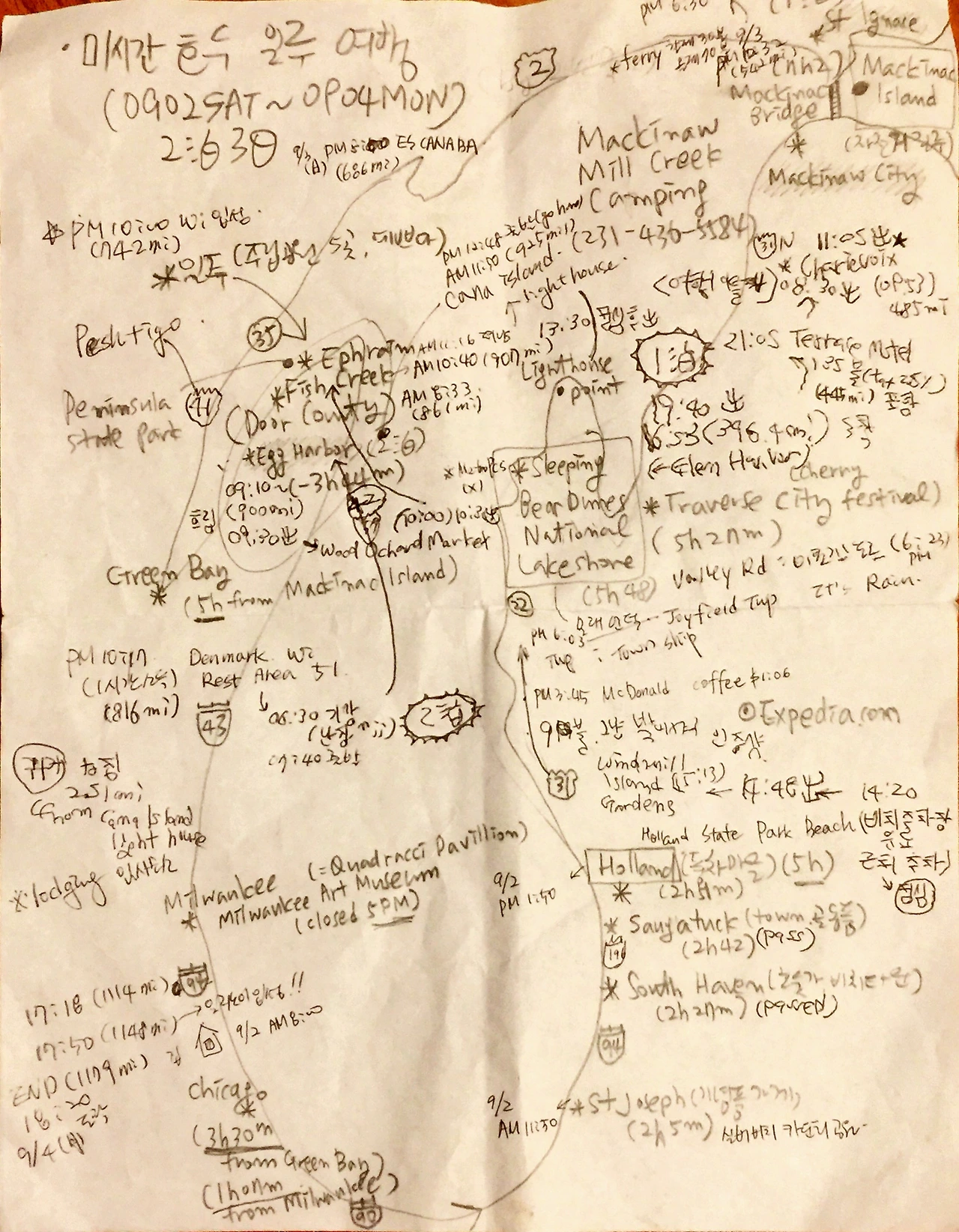 여행의 마지막 날. rest area(51)에서 난장(!) 1박은 첫 경험, 나쁘지 않았다. 안 추웠고 다리도 뻗을 수 있었다. 급할 때, 왕왕 써먹을 수 있을 1박 솔루션인데, '위험하다'는 점은 고려 대상. 06:30 일어나 화장실 양치•세수 후(샤워 못한다는 것도 단점.ㅎ) 07:40 드디어 마지막 목적지 Door County로 출발.