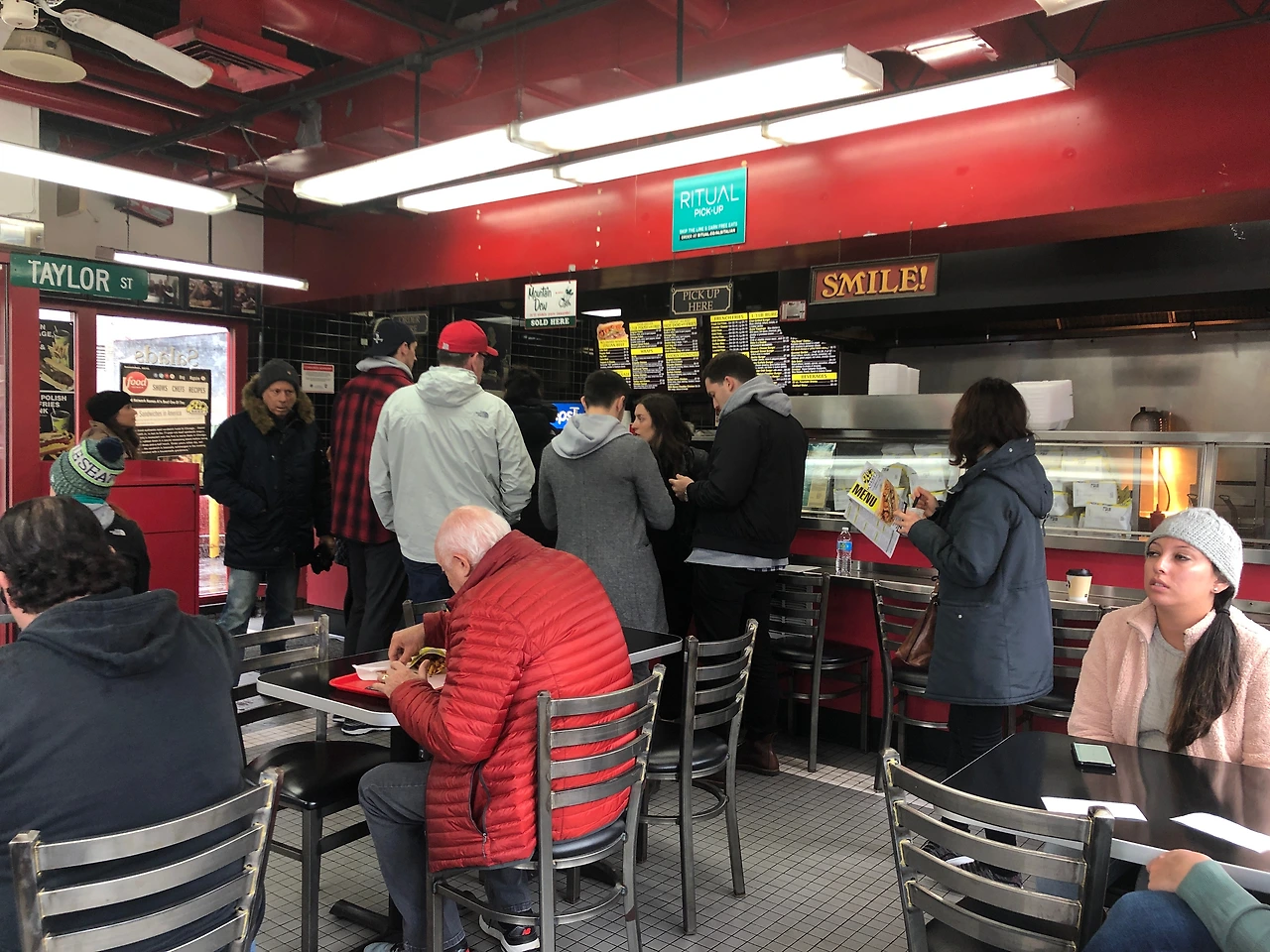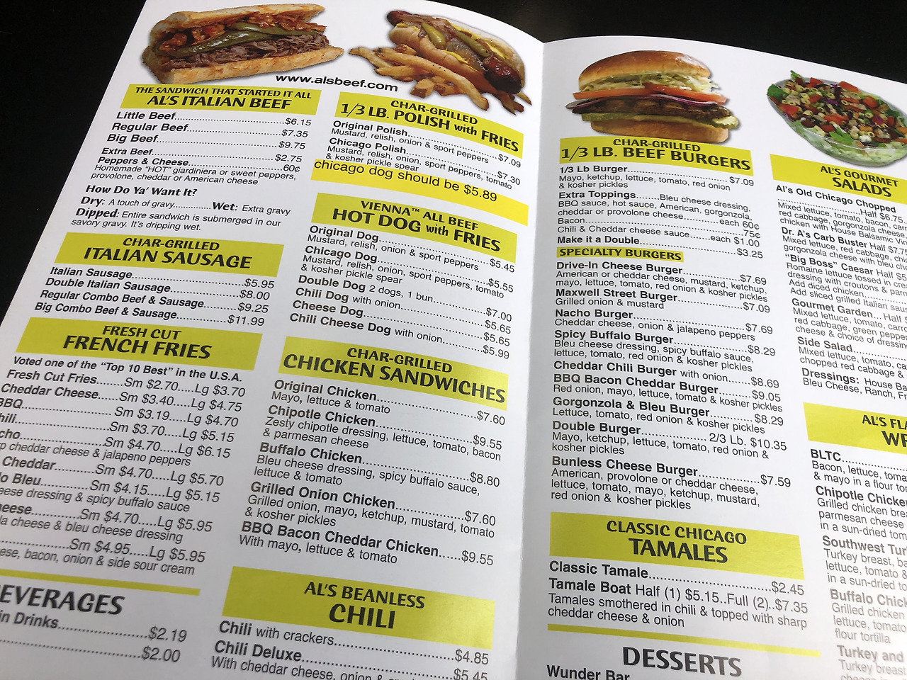 -Michgan Avenue(남/북길)와 Ontario(동/서길) 만나는 길에서 온타리오 길 서쪽으로 가다 보면 시카고 hot dog를 먹어 볼 수 있는 Portillo's라는 곳이 나옴. 시카고 태생 맛•멋 집. "Everythings on it" 하면 토마토 피클 겨자 핫페퍼 등등이 토핑으로. 바로 앞에 이층짜리 이쁜 맥도널드 있음. 커피 맛남. 조금 더 서쪽으로 가면 왼쪽에 Al's Italian beef 집이 나옴. 한국에도 소개되고 시카고밖에 없는 꼭 가야 되는 집. Italian Beef with hot pepper dipped in a gravy 시킬 것. 늦게까지 열고 밖에 앉아먹을 수도 있음.