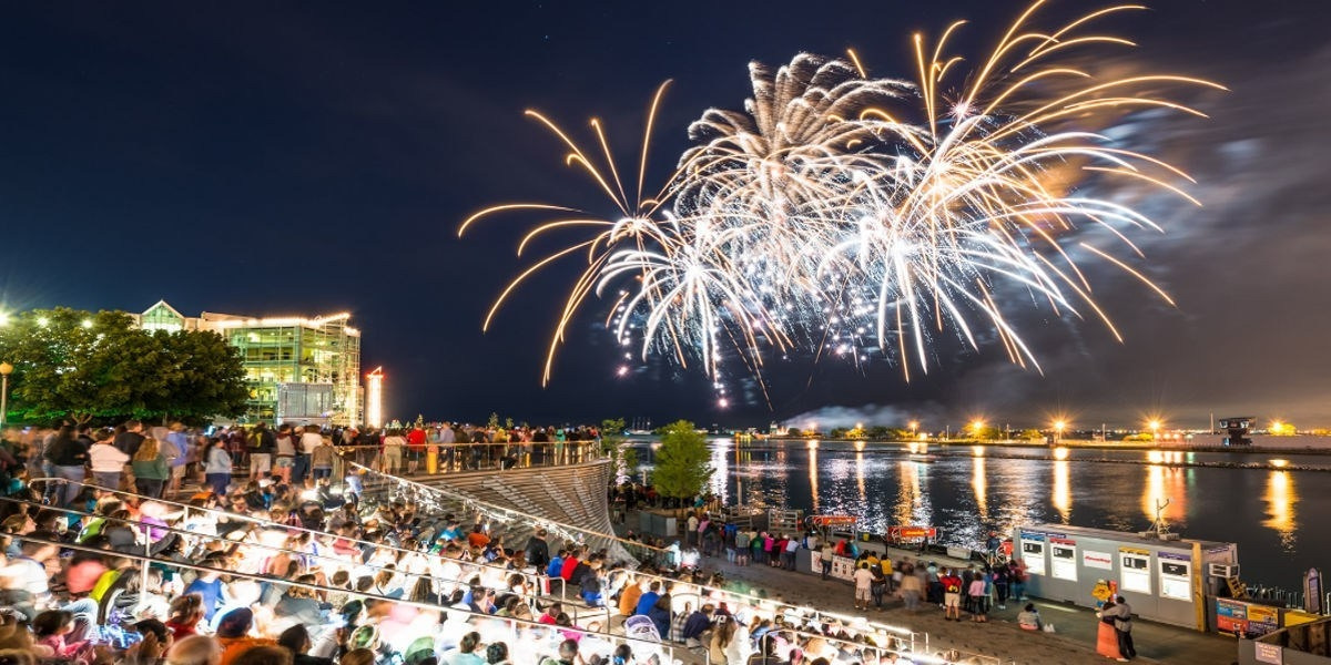 해 질 녘에 다운타운 호숫가에서 불꽃놀이