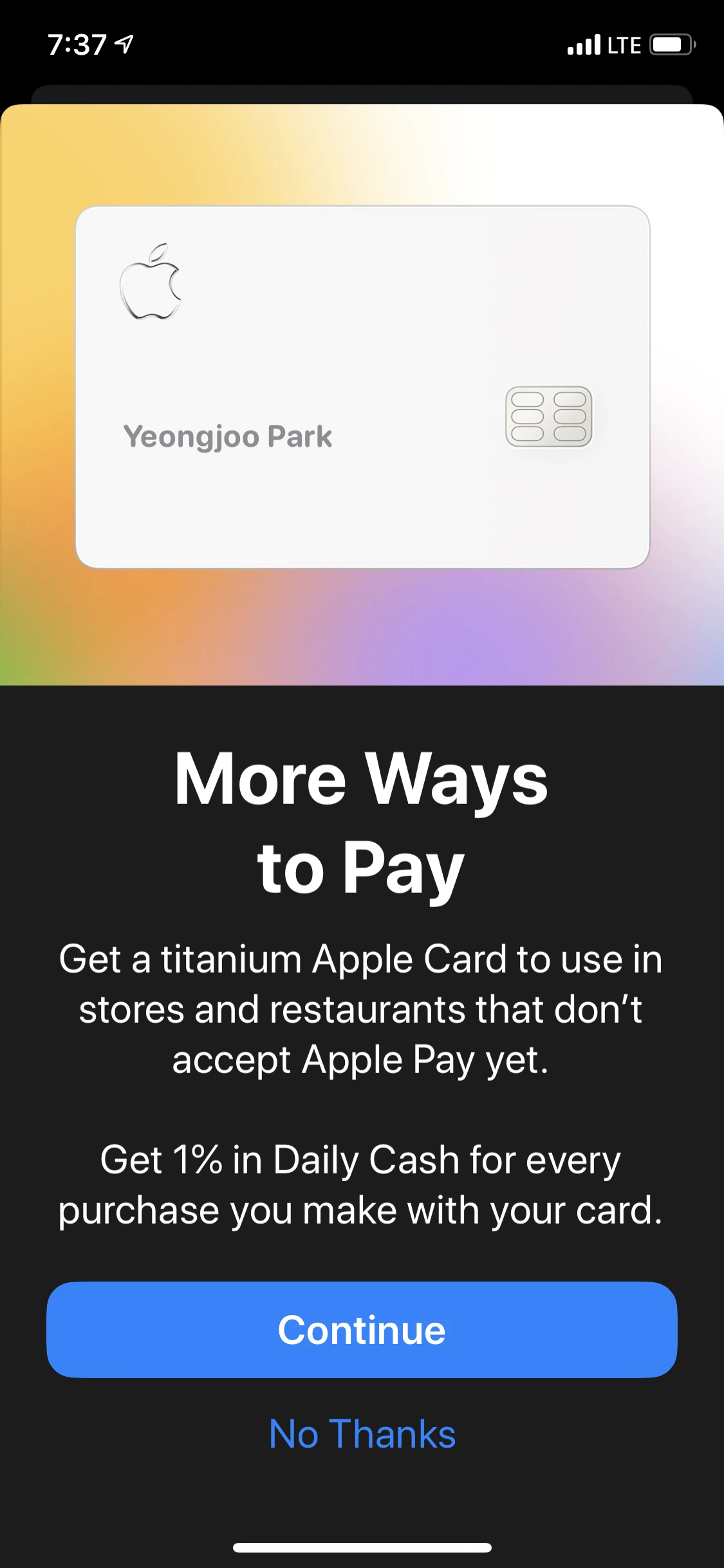 iOS 13을 설치했더니 작은 선물 하나. "애플 카드 신청할래' 하길래 "그래" 단박 대답. 하라는 대로 했더니 어렵지 않게 애플 페이 연동 단말기 내장형 카드 발급. 이어 "오프 카드도 만들래"한다. Sure!!! 주소 확인하고 등등등 입력, "며칠 내 갈 거야" 끝.