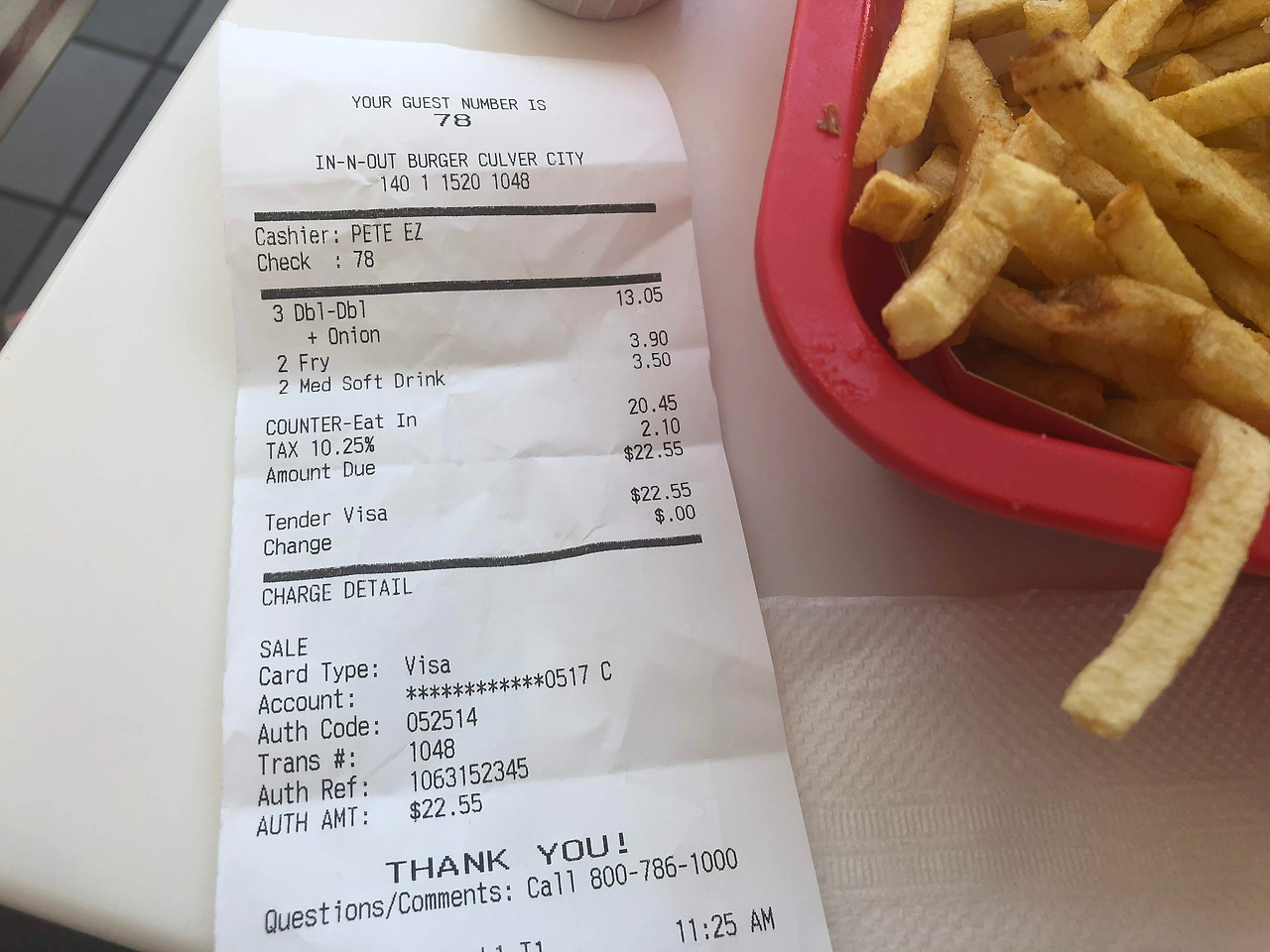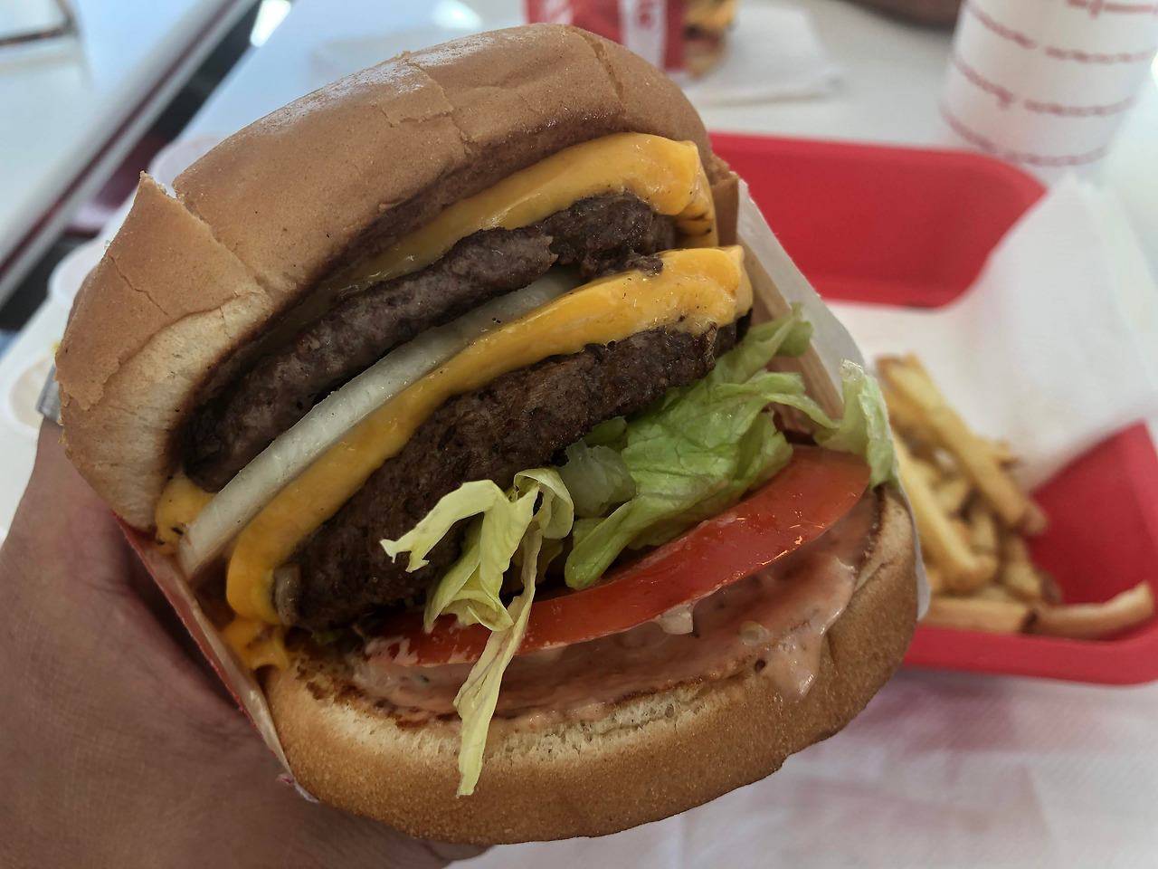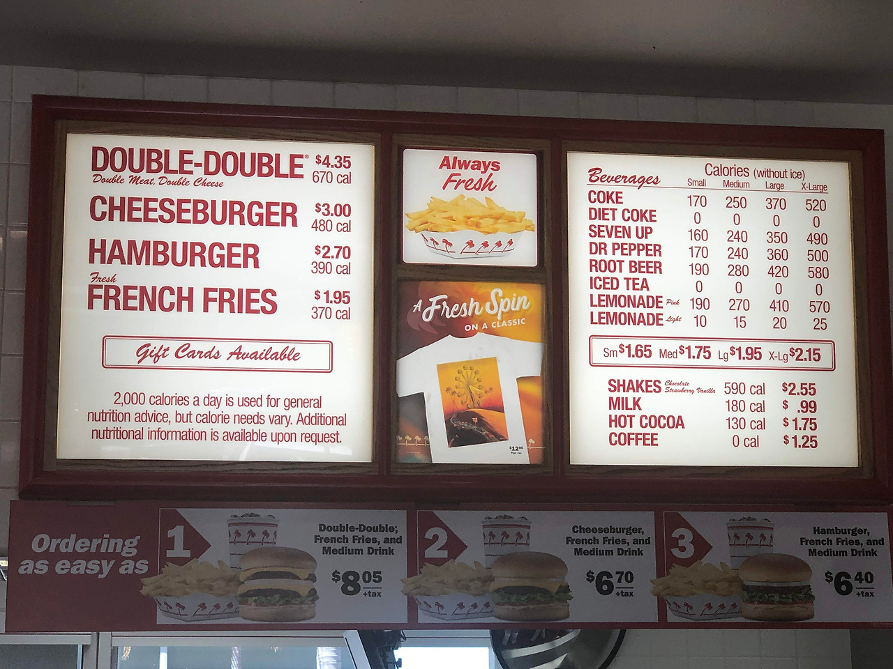 메뉴는 의외로 간단. 더블더블 포함해 버거 메뉴 4개인가 하고 음료, 기타. 더블더블을 시켰다. 다른 데와 달리 스테이크처럼 패티를 레어 혹은 미디엄으로 ‘익히는 정도’를 묻는다던데 그렇진 않더라(주문할 때 요청하면 된다고 나중 지인 귀띔)