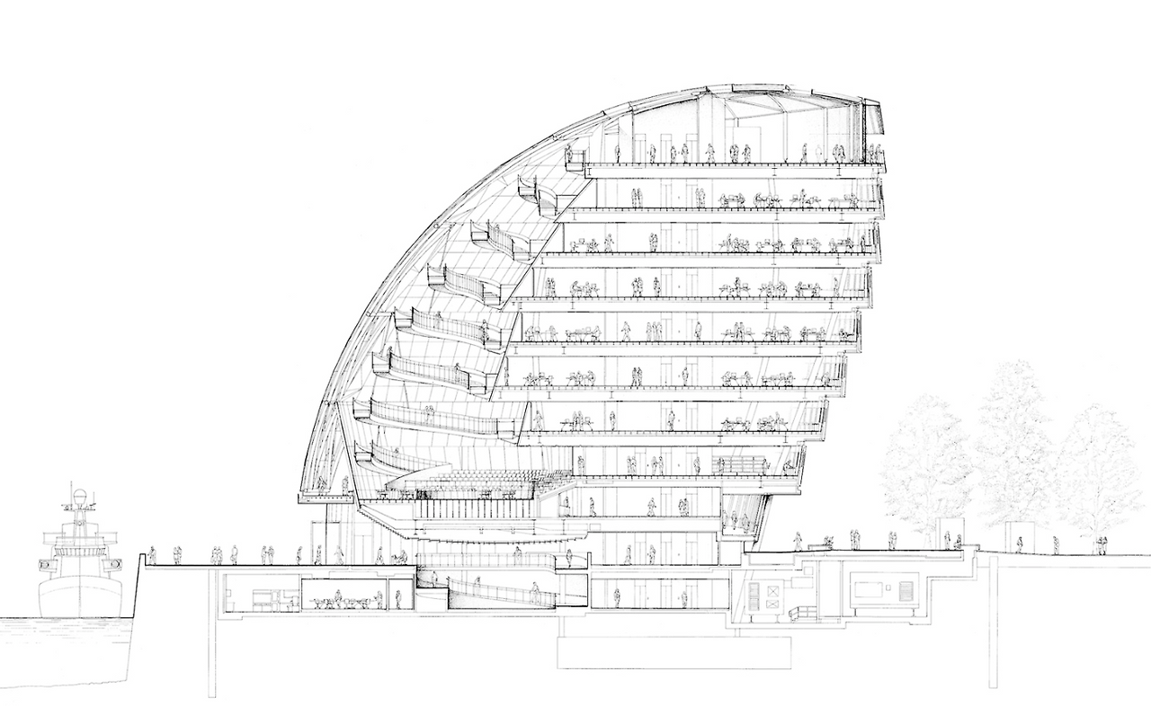 아래 그림은 런던의 시청입니다. 실제로 노먼 포스터가 그린 단면도인데요. 건축가들은 설계하는 순서를 둘로 나눈다고 할 때 평면을 먼저 설계하거나 단면을 먼저 떠올리면서 설계를 한다고 하더라고요. 그중에 노먼 포스터는 후자였습니다. 아래처럼 단면을 떠올려서 설계를 한다는 것이죠. 이 건물의 왼쪽 부분을 이동통로로 만들면서 공기순환 흐름을 할 수 있도록 설계해 놓은 것 같아요. 이처럼 과학적인 방법으로 건축물을 지을 때 최대한 에너지를 절약해서 자연친화적으로 건물을 사용할 수 있도록 고려해 놓는 설계를 추구했다고 합니다. 그래서 참고로 2007년 TED talk에 나와서 이야기한 영상 자료를 같이 올려놨어요.