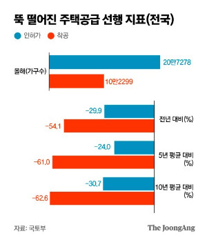 건축물의 사용승인을 받는 단계가 바로 준공입니다. 그렇지만 착공이 줄어들었는데 준공이 늘어날 리가 없죠. 공사도 안 했는데 갑자기 주택이 생길 수 없으니까요.