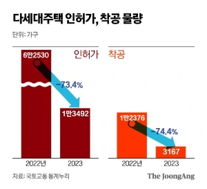 주택의 형태 중에 다세대주택 즉 빌라도 있습니다. 아파트뿐만 아니라 대체 주거상품도 인허가, 착공 물량이 현저하게 감소하고 있어요. 당장 눈에 보이는 문제는 없습니다. 다만 앞으로 주택 공급이 줄어들어 가격이 불안정 해지는 것뿐만 아니라 주거의 질이 하락할 가능성이 커지는 거죠.
