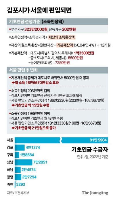 추가로 김포가 서울이 되면 기초연금이나 기초생활보장 수급자 선정 기준이 일부 달라지면서 대상자가 늘고 수령액이 올라간다. 단순하게 본다면 기초연금이 16만 원 늘지만 누군가에겐 박탈감이 생길 수 있다는 것이다.