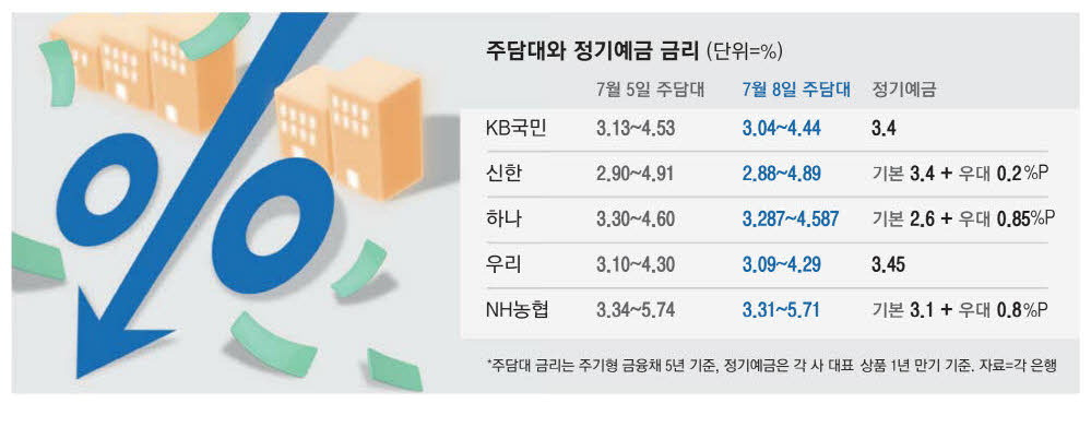 주택담보대출 금리가 계속해서 떨어지고 있다. 동시에 가계대출이 35개월 만에 가장 큰 폭으로 늘어나고 있다.