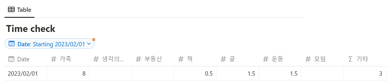 2023년에는 노션(notion)을 잘 활용해 보기로 결정했어요. 그래서 노션에서 매일 카테고리별로 몇 시간을 썼는지 기록할 수 있도록 표를 만들어놨습니다.