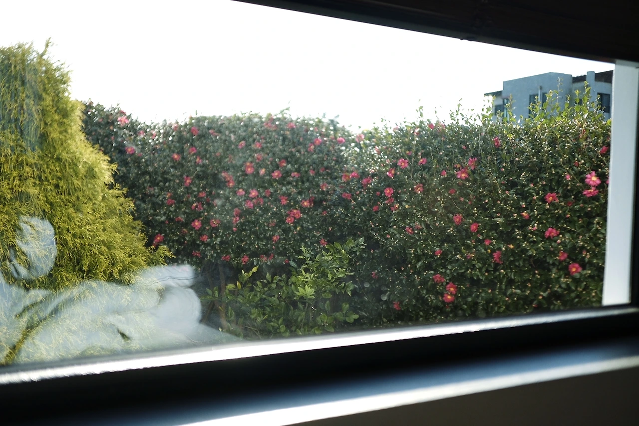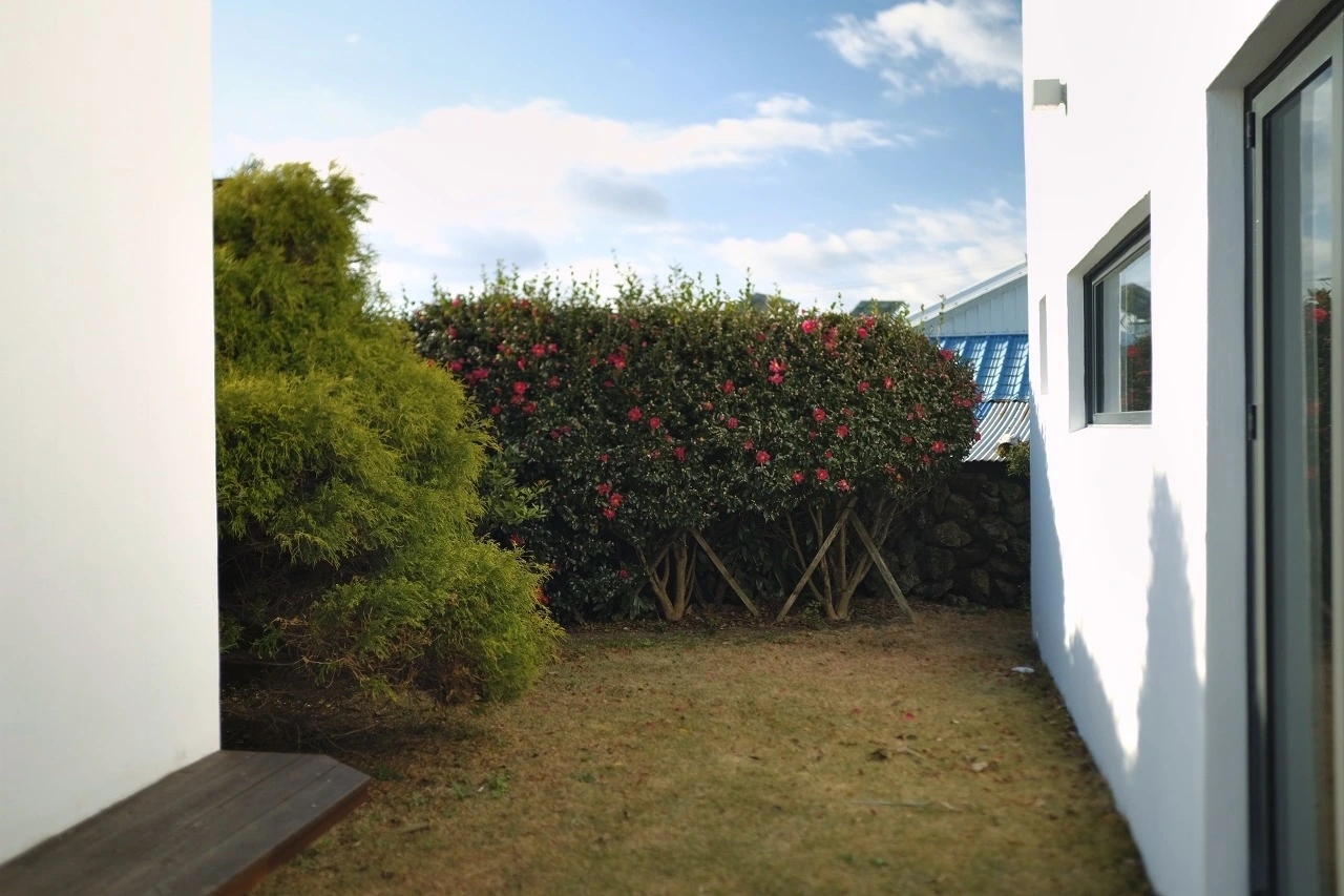 꽤 오랜 시간의 수다를 마친 뒤, 반쪽은 2층 욕실에 틀어놓은 물이 적당한지 체크하러 올라갔고 나는 거실 옆 작은 계단으로 분리된 침실 옆에 짐을 정리했다. 짐을 정리하다 침대 오른편에 앉아 유리 창문을 통해 하늘을 바라보니 구름 한 점 없는 제주 겨울밤이 화면보호기로 틀어놓은 파노라마처럼 맑게 보였고, 그다음 날 이 창문 건너로 볼 동백나무 정원도 기대가 되었다. 이 창문 외에도 높은 천장이 심심하지 않게 여러 모양의 유리 창문들이 배치되어있어 풍경 보는 재미가 남달랐다.