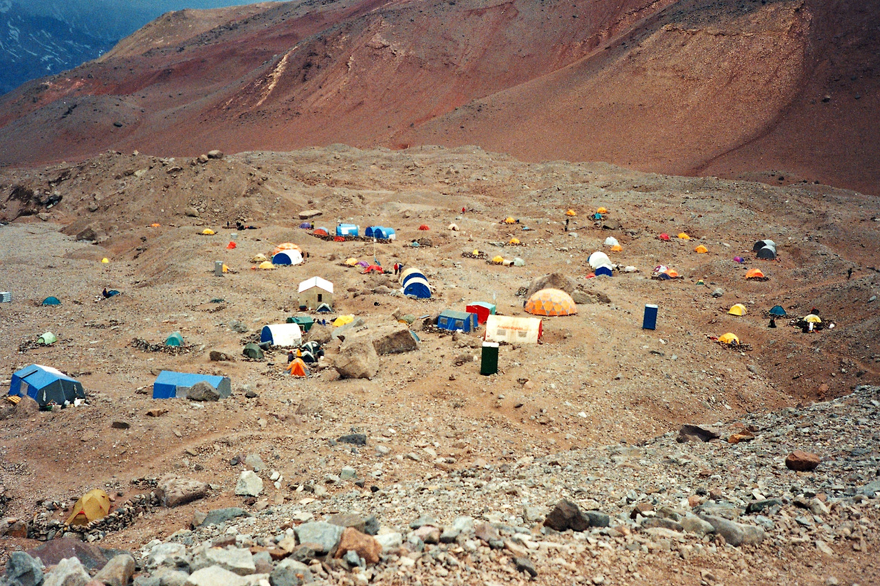 베이스캠프, 이곳은 눈대신 황량한 모래가 있어 바람이 심하면 모래폭풍이 닥쳐 텐트가 날아가는 일도 다반사다.