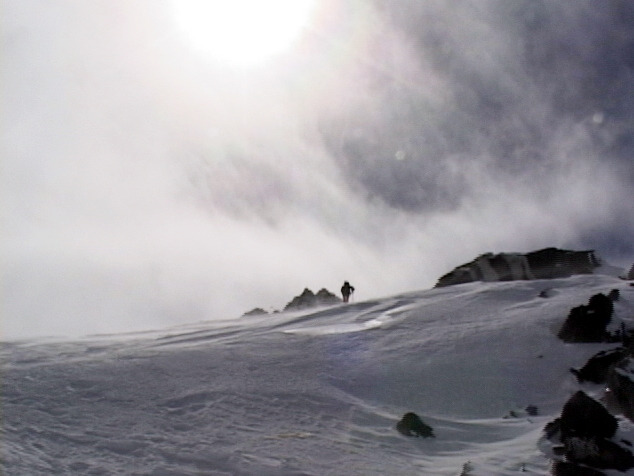 비탈사면에서 약간 내려서서 오른쪽 설사면에 아이스바일을 깊게 박으며 한걸음씩 신중하게 전진했다.