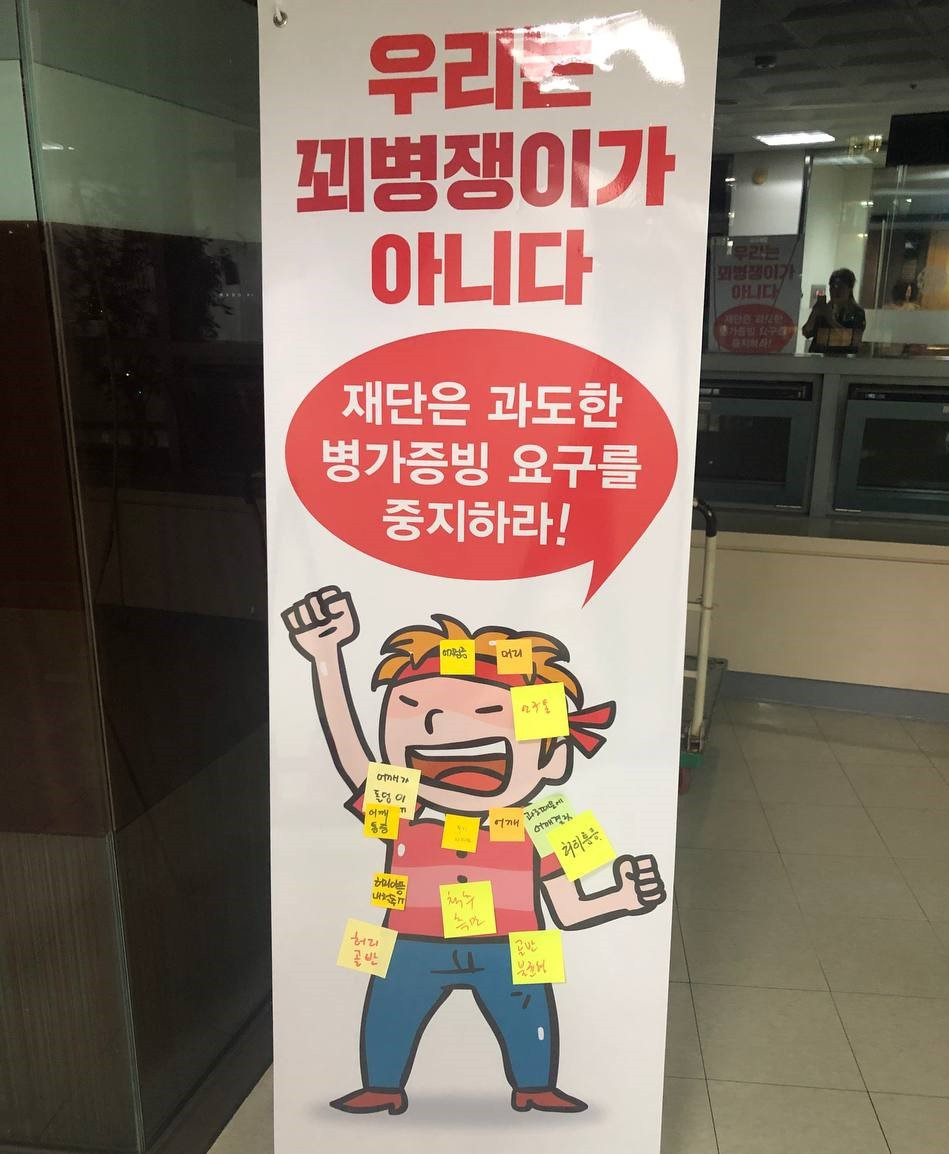 사측은 사무실 출입문에 아무것도 부착하지 말라고 한 이유가‘시민이 보기에 불편하다’라고 했다. 그런데 교통이 편리하고 대관료가 낮아 이미 전국의 많은 노조들이 장소 대관을 하는 그 건물에서 이런 말은 그야말로 ‘이용자’를 적대시하는 태도를 드러낸 것이고, 노조 포스터 하나도 불편해한다고 ‘시민’을 옹졸한 존재로 깔아보는 것이었다. 당시 같은 건물에 입주해 있던 단체의 한 실무자가 이 이야기를 듣고 ‘불편할 거라고 하는 말이 (시민인) 나는 더 불편하다’고 했고, 우리는 그 문장을 대자보에 넣었다.