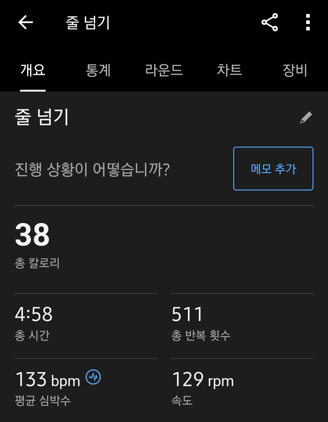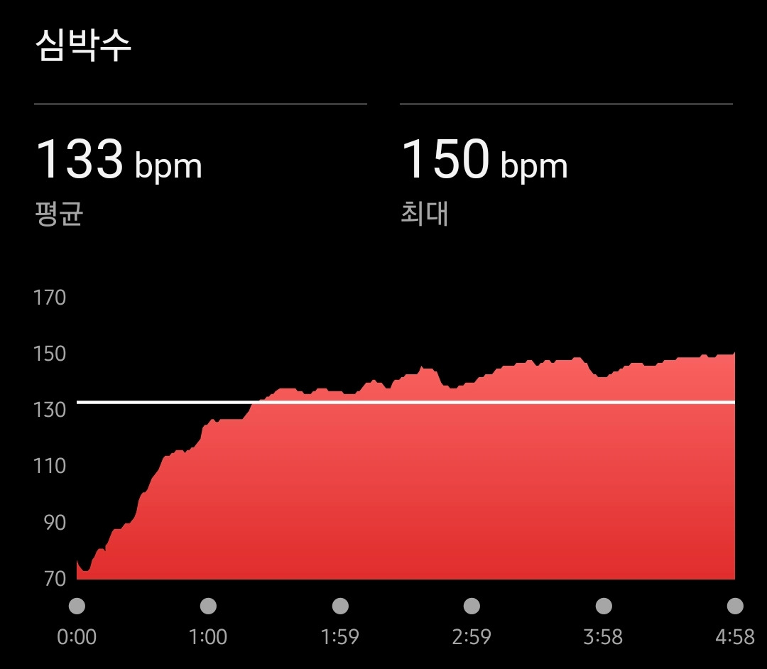 시간은 5분 남짓으로 생각보다 얼마 안 걸렸지만, 심박수는 1분대에 이미 130 bpm을 넘어섰고, 칼로리도 40 kcal나 태웠다..