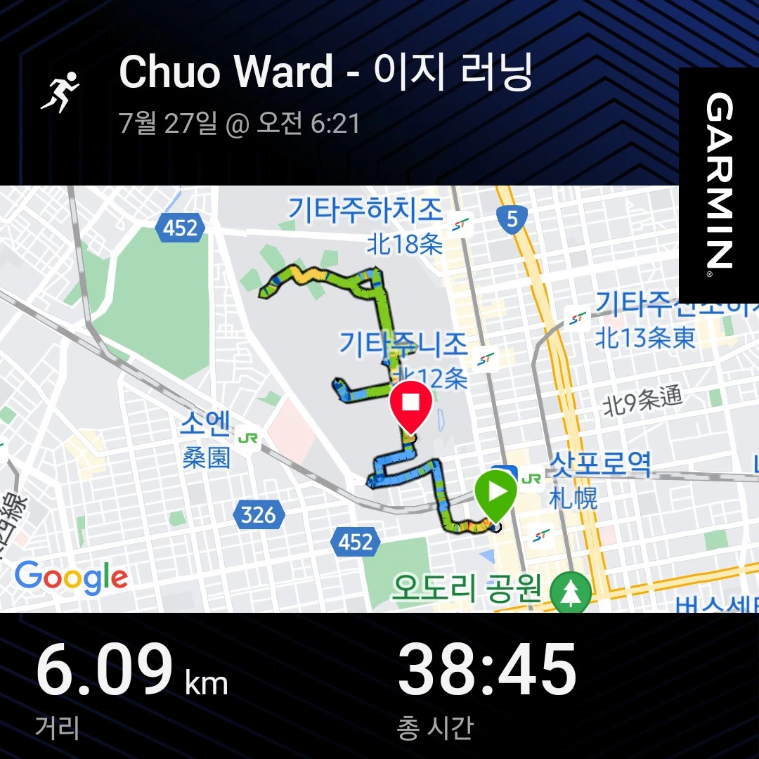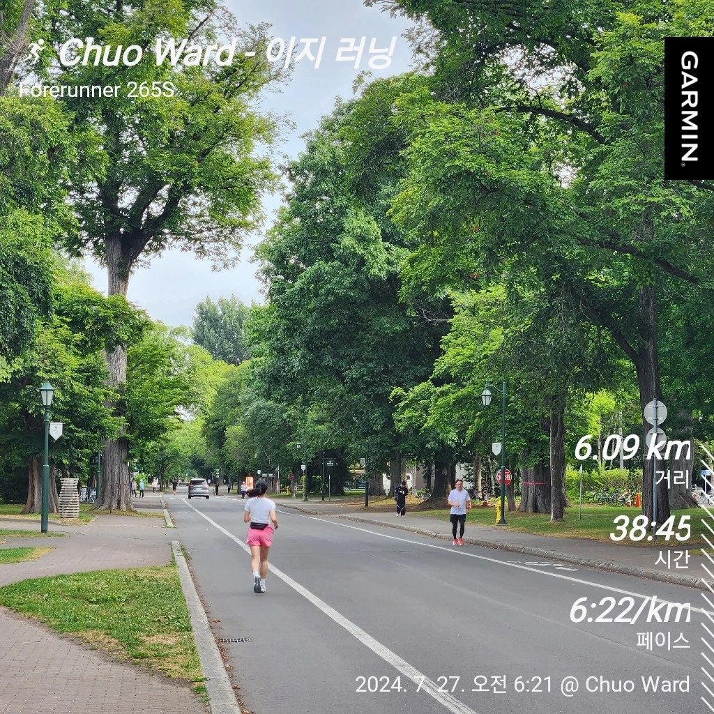 혹시 몰라 바람막이를 입고 나갔는데, 6 km 뛰고 나니 땀이 적당히 났던 것으로 보아 바람막이를 안 입었어도 홋카이도의 맑은 바람도 쐴 겸 괜찮았을 것 같다.