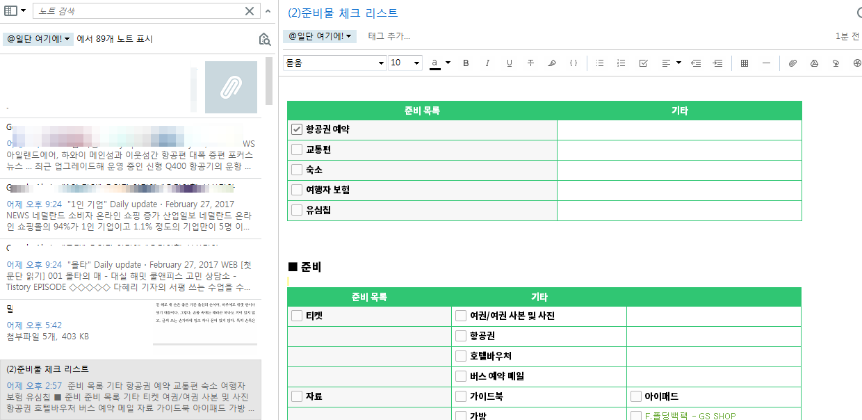 여행 준비물은 체크리스트 노트를 따로 만들어 관리한다. 기본적으로 필요한 것을 적어놓고, 생각이 날 때마다 노트를 열어 준비 항목을 추가한다. 준비물 중 구매할 것은 해당 사이트와 연결하기도 하고, 다른 노트와 연계하기도 편해서 여러모로 유용하게 사용하고 있다.