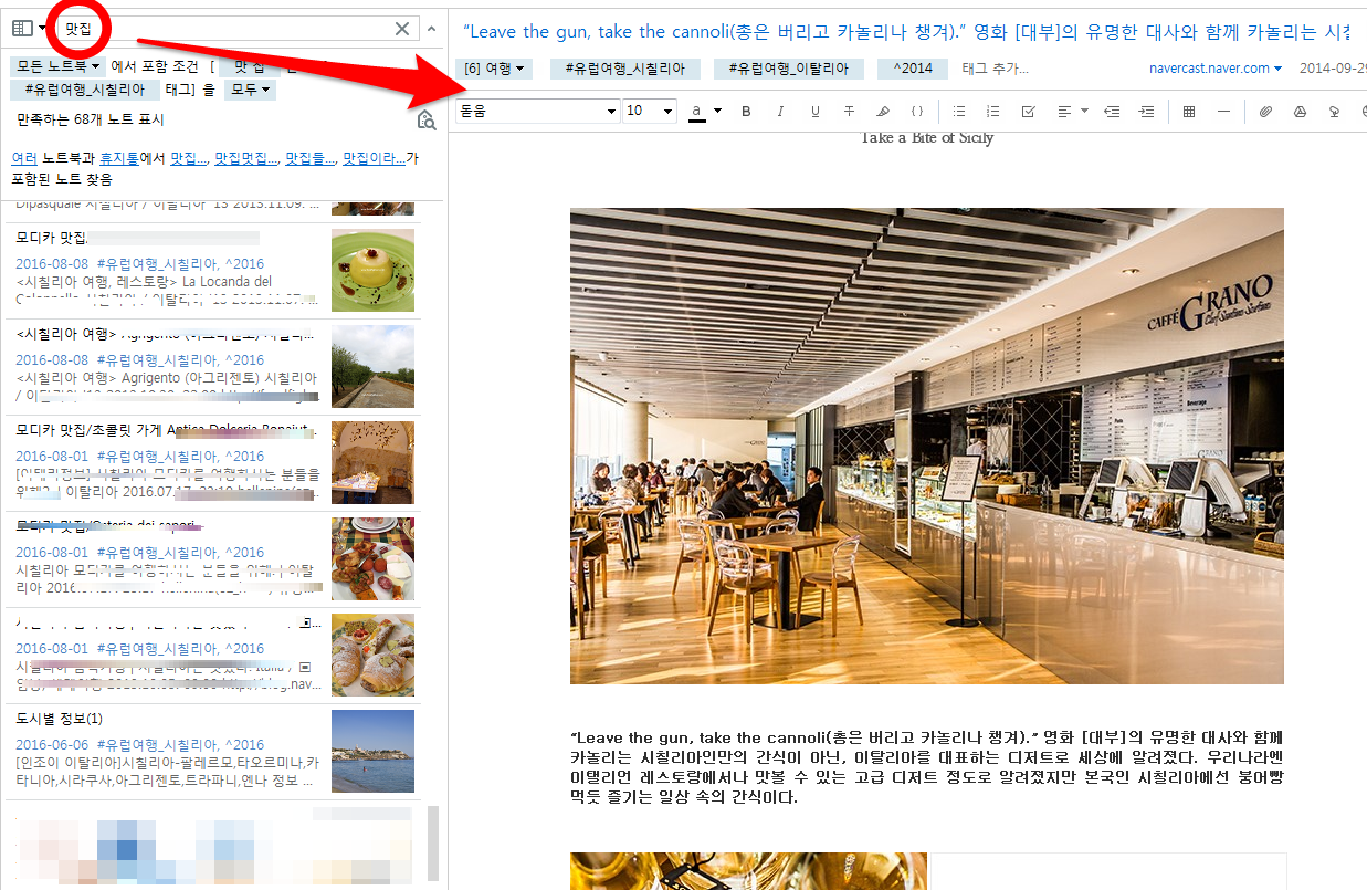 에버노트 내에서 자료를 구분할 수 있는 큰 틀은 노트북과 태그다. 내 경우, 큰 덩어리의 주제는 노트북으로 나누고 세부적인 구분은 태그로 하는 편이다. 예컨대 시칠리아 여행 정보를 모은다면, '시칠리아 여행'이라는 태그를 만들고 그 안에 관련된 정보를 모두 넣어둔다. 물론 더 구체적으로 나눌 수도 있다. '시칠리아 숙소', '시칠리아 맛집', '시칠리아 도시 정보' 등으로 태그를 만들어두면, 한층 더 자료 찾기가 쉽다. 단, 나는 태그를 세부적으로 나누지는 않는 편이다. 여행뿐 아니라 글쓰기, 강의 등 작업하는 자료의 범위가 넓은 편이어서 그 모든 것을 구체적인 태그로 나누면 관리하기가 어렵기 때문이다. 앞에서 말했던 '시칠리아 여행'이라는 태그를 만들고, 세부 내용은 검색으로 찾아서 활용하는 방법을 주로 쓴다.