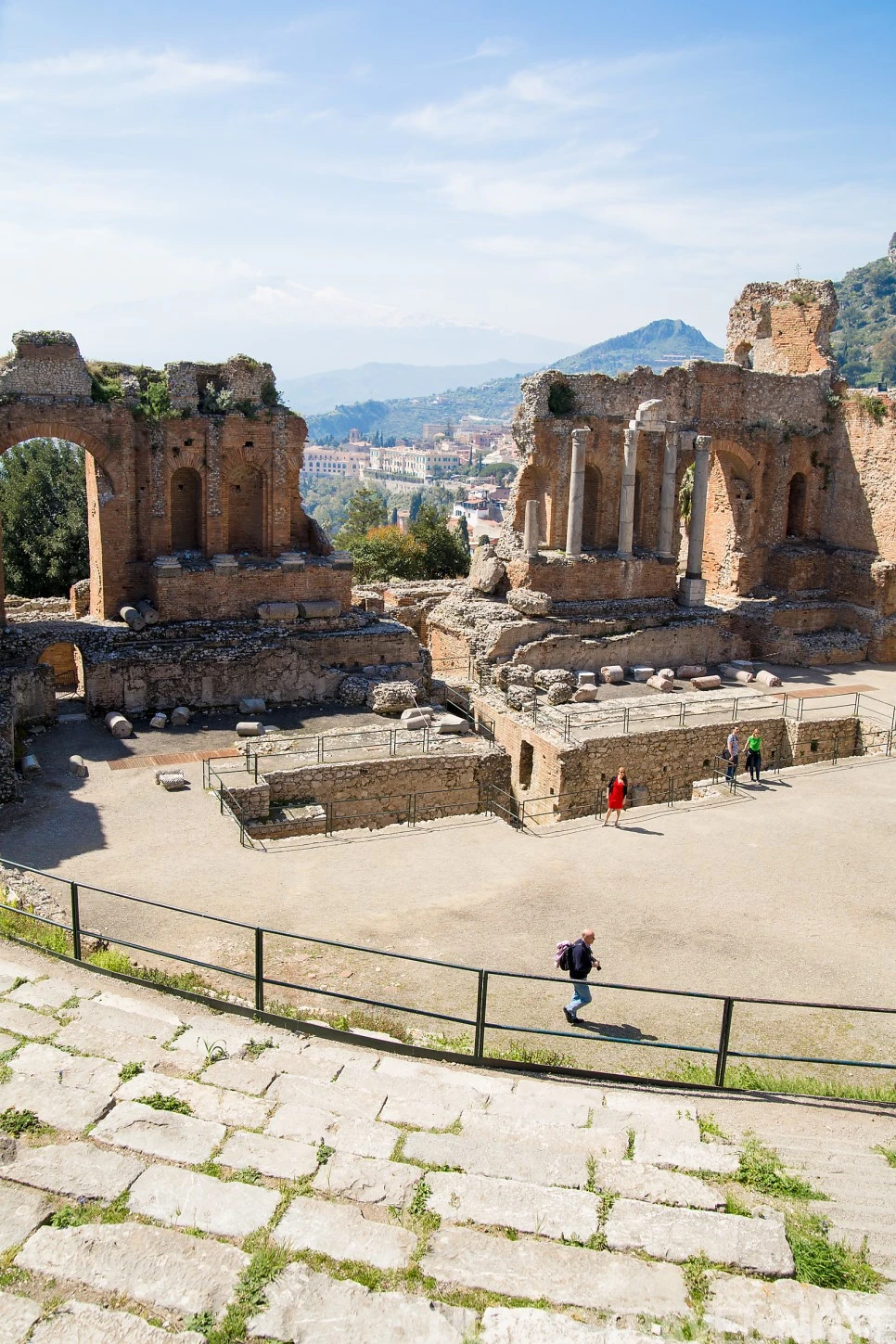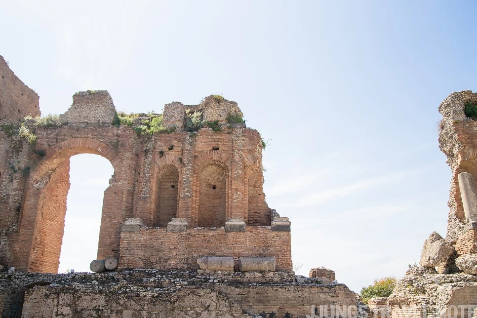 극장 꼭대기에 올라섰다. 그리스인들이 얼마나 아름답게 극장을 지었는지 알 수 있었다. 최대 지름 120m로 시라쿠사 다음으로 시칠리아에서 큰 극장이라고 했다. 9개의 섹터가 균형 있게 나누어져 있었고, 계단 꼭대기에는 둥근 아치의 이중문이 가지런히 관람석을 둘러싸고 있었다. 산의 비탈은 별달리 손볼 필요 없이 그대로 카베아(cavea)가 되었다. 무대는 절벽 가장 가까운 곳에 있어 하늘이 무대의 연장선 같았다. 극장 정면이 무너진 것조차도 예술 작품 같다. 그 틈으로 타원형으로 굽어진 이오니아 해가 있었고 저 멀리 에트나 산이 희미하게 보였다. 끊임없이 피어나는 흰 연기인지 구름인지 헷갈린다. 하늘 위에서 내려다보는 극장의 풍경은 어떨지 궁금해진다. 신이 있다면 절벽 끝에 우아하게 걸쳐있는 극장을 보고 인간이 만든 아름다운 예술이라 감탄하지 않았을까. 그리스인들의 아름다움을 위한 노력은 신을 향한 믿음에서부터 시작된 것이 아닐까 상상해본다.