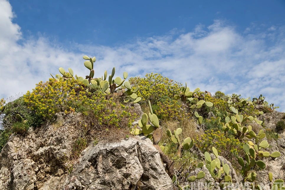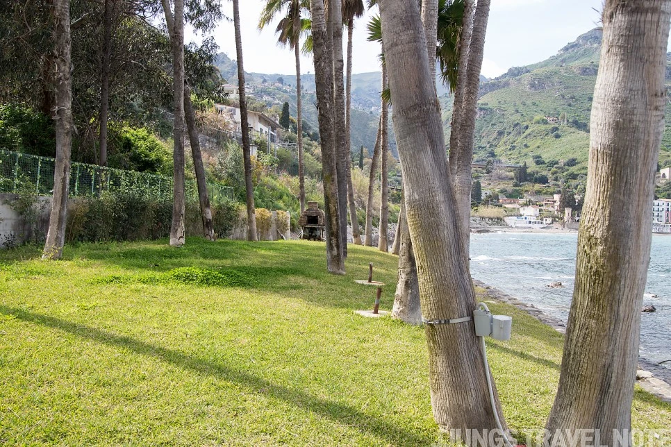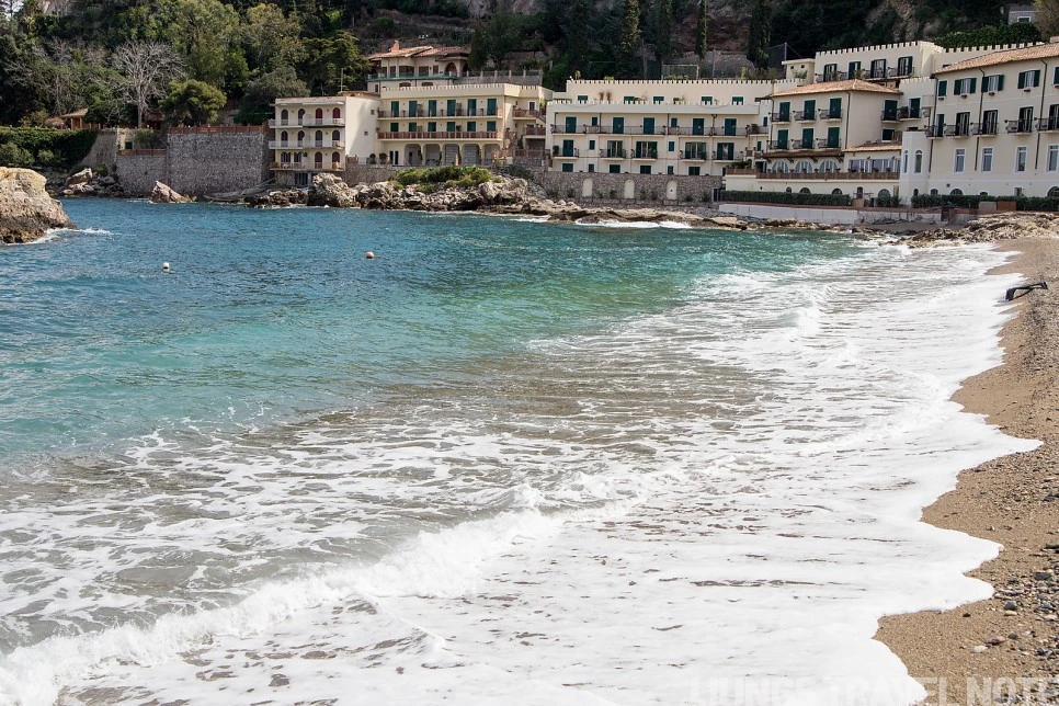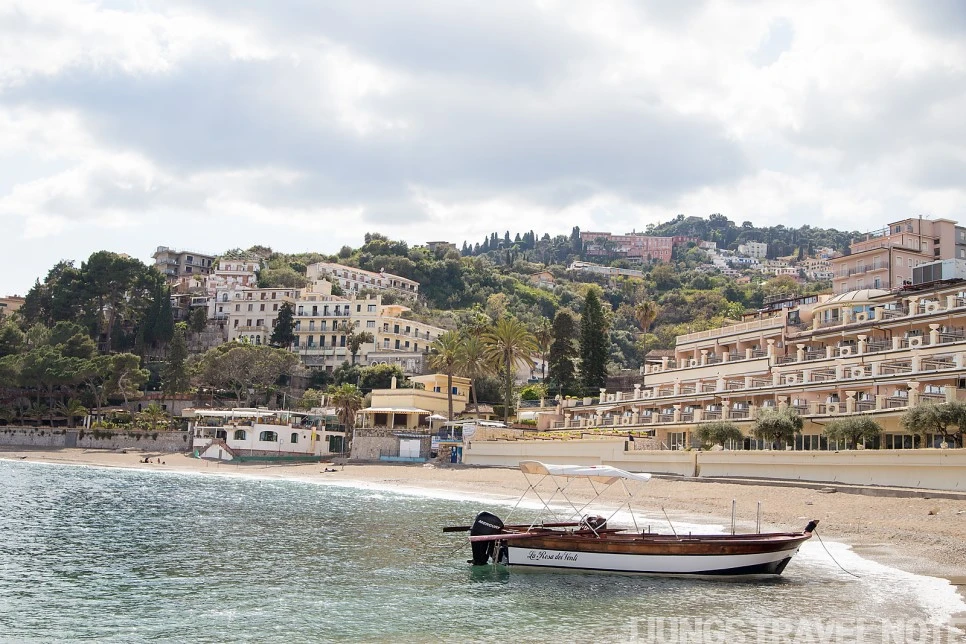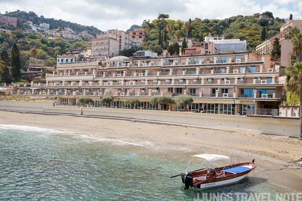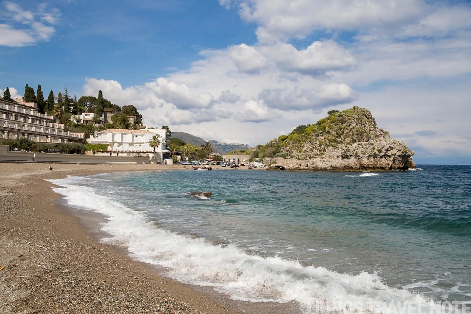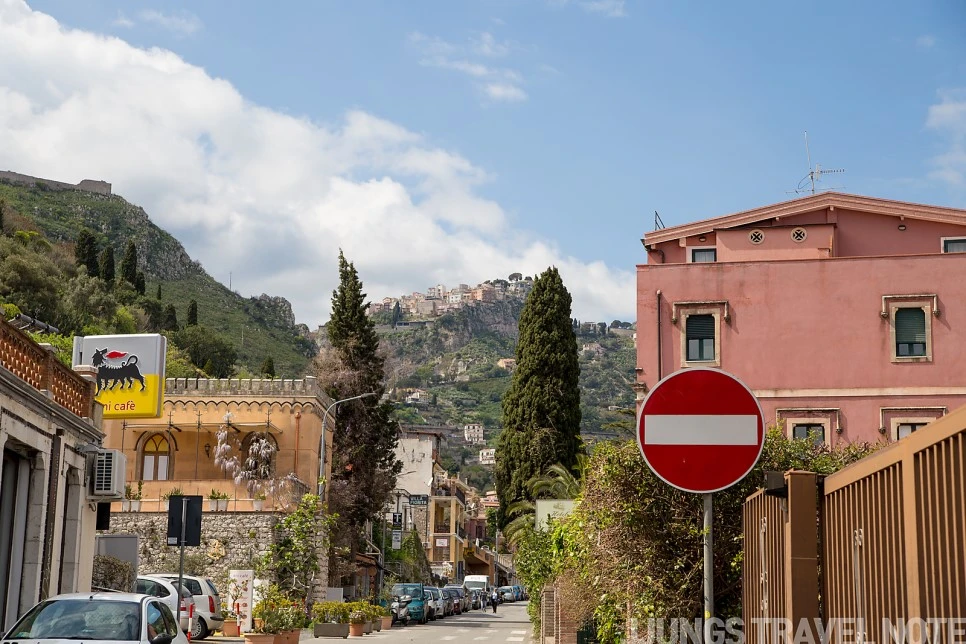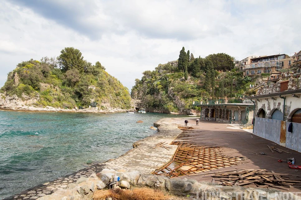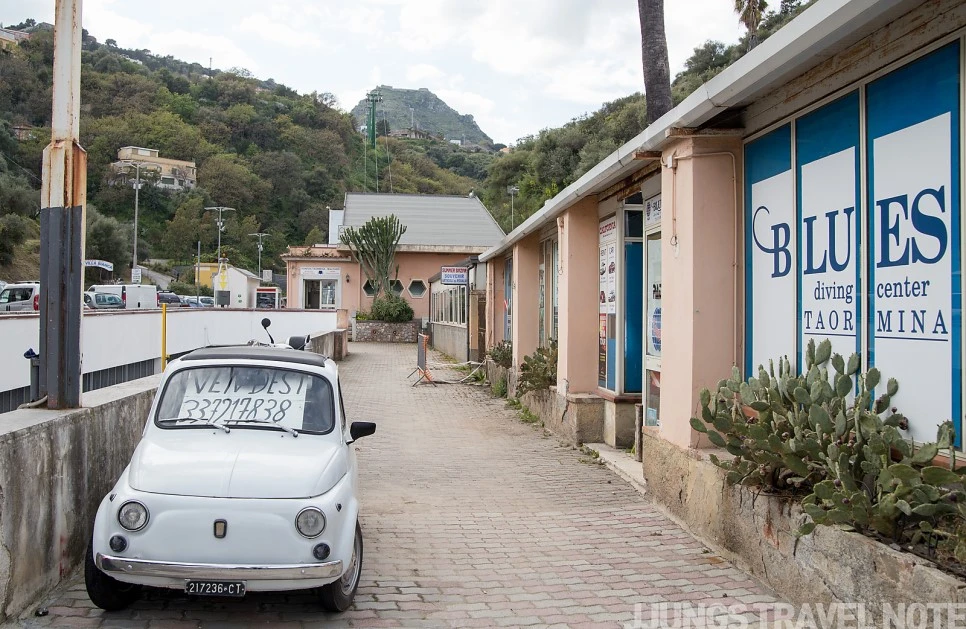 해변은 아니지만, 작은 공원 숲이 있는 이 포인트도 마음에 드는 곳이었다. 수심이 깊은 바다와 건너편 마을이 한 번에 보이는 곳. 반대쪽은 투어 코스일지도 모를 작은 동굴이 보인다. 벤치에 앉아 풍경을 감상하는데, 갑자기 이 공간이 낯설고 무섭게 느껴졌다. 한 시간 가량 공사하는 인부 두어 명 외에 사람 코빼기도 볼 수 없었기 때문이다. 서둘러 나와 다시 타오르미나로 올라간다.
