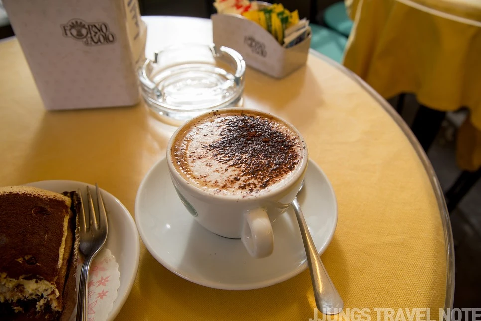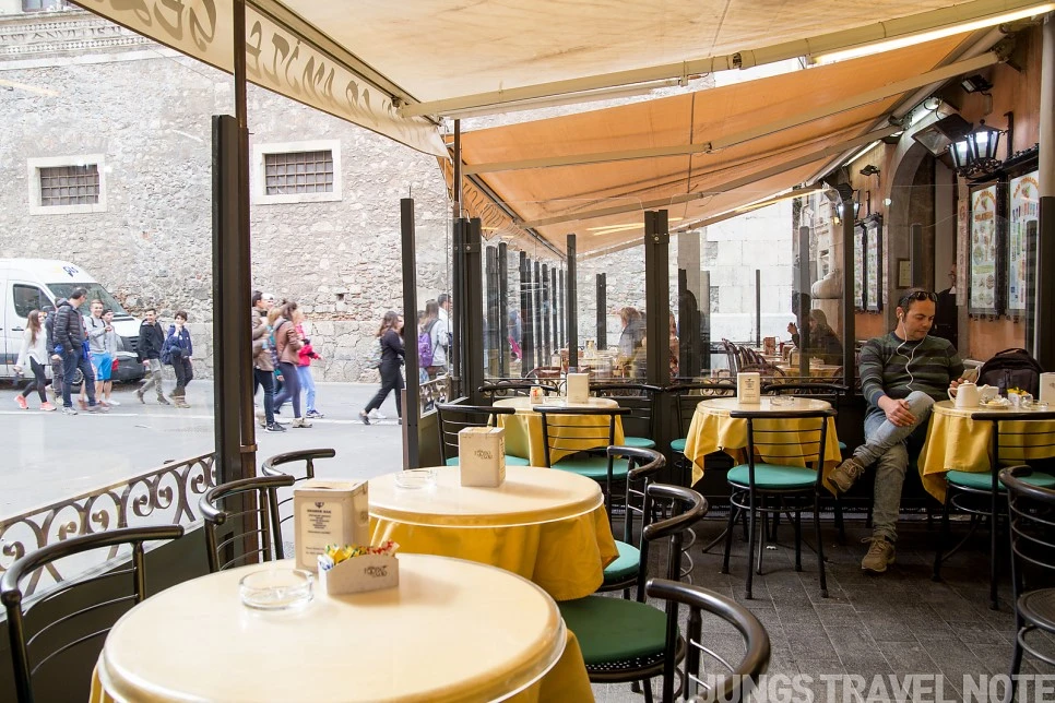 카타니아로 가는 막차를 타기로 했기에, 시간이 여유 있었다. 타오르미나 마을 입구에 있는 한 카페에 가서 잠깐 쉬어가기로 한다. 노란색 테이블이 산뜻한 분위기의 카페. 그것 때문에 여기 들어왔다. 약간 느꼈던 두려움을 달래기 위해서일지도 모르겠다. 티라미수와 카페라떼를 주문하고 나니 비가 후두둑 쏟아지기 시작한다. 관광객들은 그래도 즐거운 듯 웃으며 마을을 빠져나가고 있었다.
