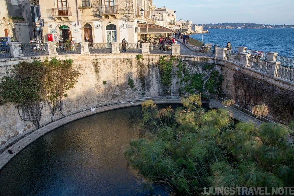 바로 옆에는 아레투사의 샘(fonte aretusa)이 있다. 얼핏 보면 평범해 보이는 연못이지만, 신화의 나라답게 여기에도 전해지는 이야기가 있다. 숲 속의 님프인 아레투사가 강의 신 알페이오스 구애를 피해 도망치다가 지하수로 변해 시칠리아의 시라쿠사까지 흘러들어와 이곳의 샘이 되었다는 설이다. 시칠리아 어디에건 그리스 신화의 전설이 숨겨져 있는 곳이 있어 보는 재미를 더한다.