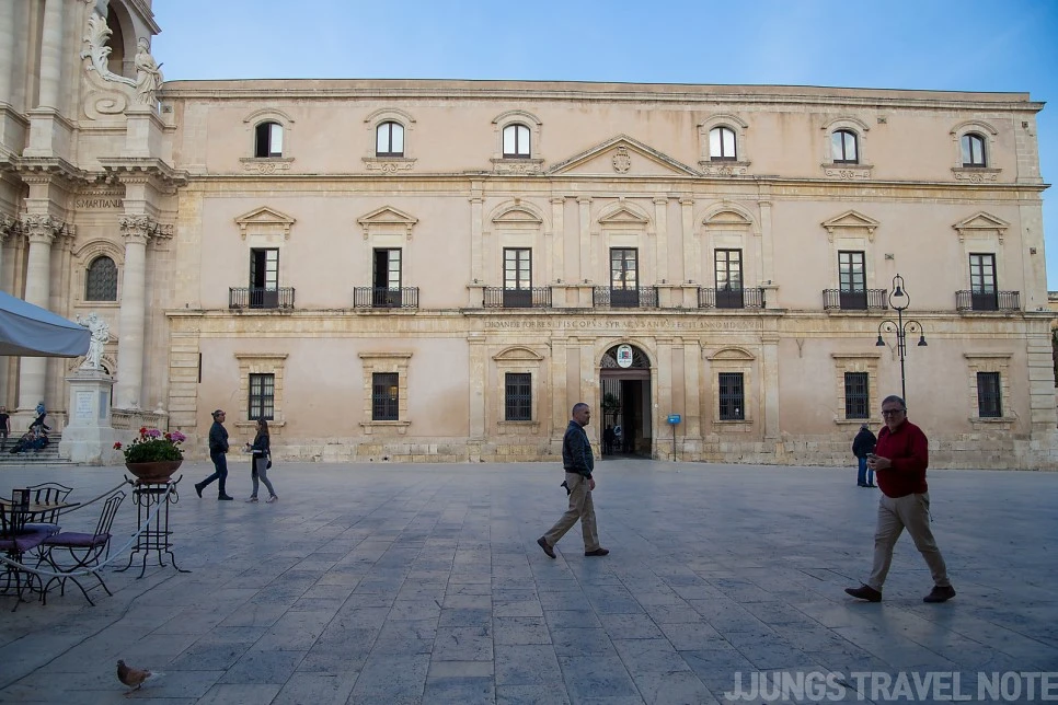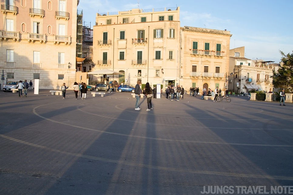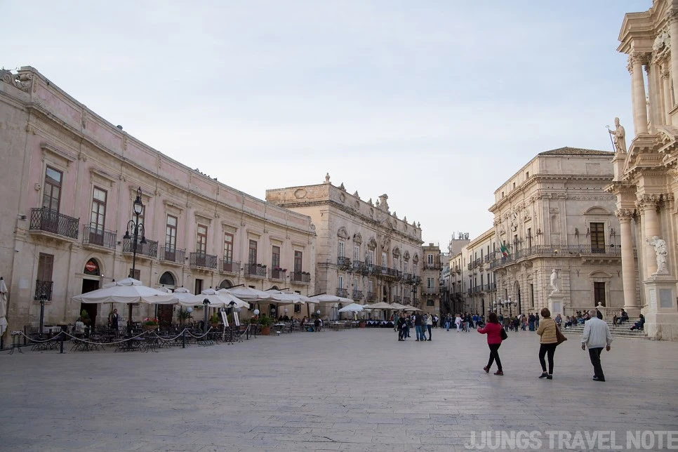 바닷가 길에서 중심가로 골목길을 따라 들어오면, 무조건 두오모 광장(Piazza Duomo)으로 들어오게끔 되어 있다. 오르티지아 섬의 중심지로, 시라쿠사의 꽃이다. 영화 <말레나>의 배경으로도 유명하고, 바로크 양식의 건축물로 둘러싸여 있어 시라쿠사에서 가장 화려한 곳이다.