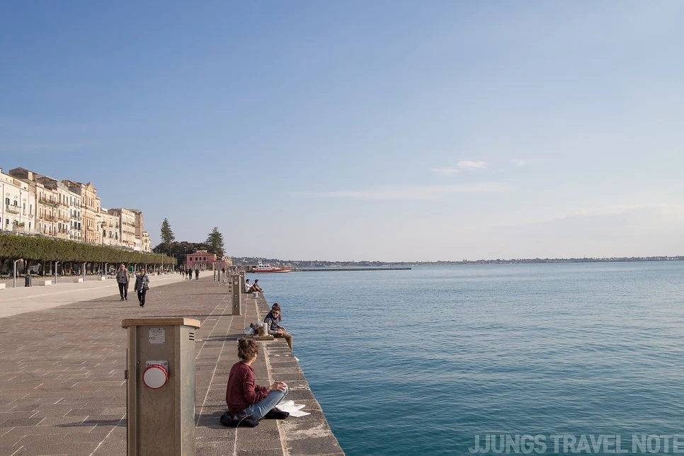 번화가를 지나쳐 바다로 이어진 길을 따라 걸었다. 다른 도시의 바다와 다른 건 바로 앞에 넓은 광장이 있어서다. 가족, 연인, 혼자인 모든 사람들이 이곳을 산책하거나 바다를 바라보고 있었다. 시라쿠사에서 내가 제일 좋아했던 길이기도 하다. 인상적인 풍경은 바다를 바라보며 두꺼운 책을 보고 있는 사람. 그 모습이 자유로워 보인다.