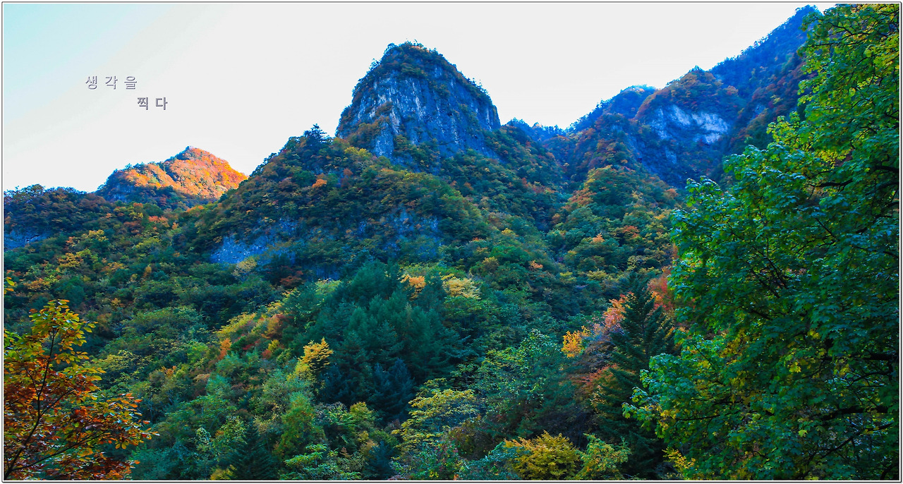 내가 서있는 곳은 아직 해를 볼 수 없지만 멀리 건너편 산봉우리에는 따스한 햇볕이 만추의 가을 산의 화려함을 더욱 화려하게 해주고 있었다.