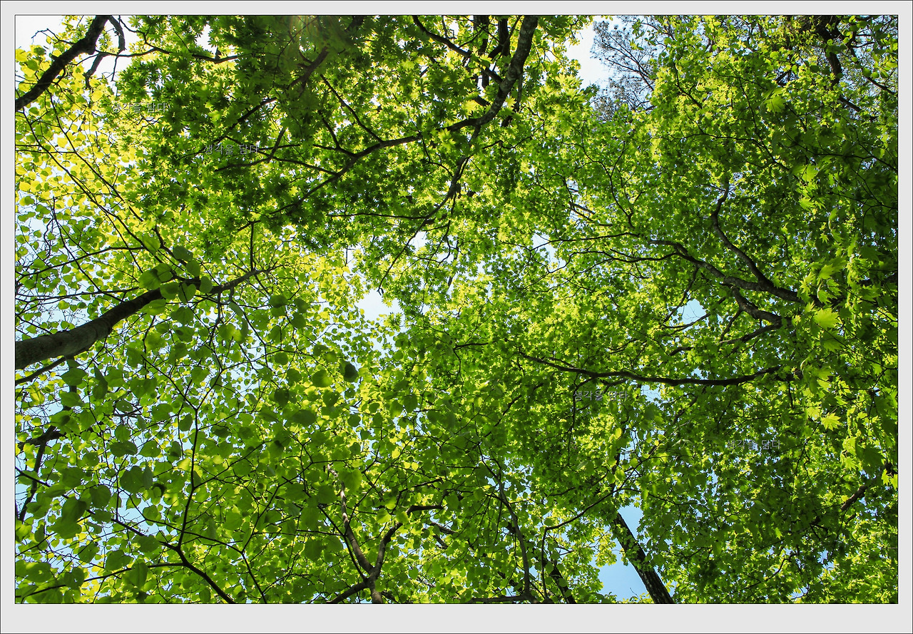 지천에 만개한 노란 애기똥풀 꽃의 환영을 받으며 산길에 들어서자 싱그러운 오월의 연둣빛 세상이 펼쳐졌다.