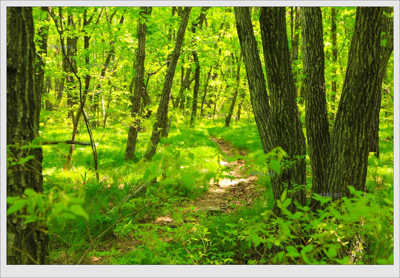 참나무가 주종을 이루는 잡목 숲으로 이루어진 초반 산길은 전형적인 흙길이어서 가파르고 별로 볼거리도 없다.