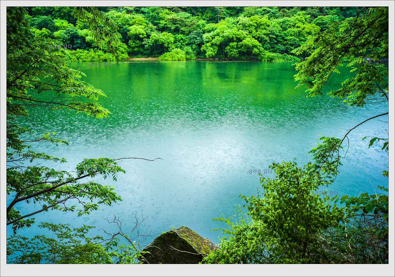 잔잔한 호수 수면 위로 굵어지기 시작한 빗방울들이 점점이 박히는 모습이 신비감을 자아내고 있습니다.