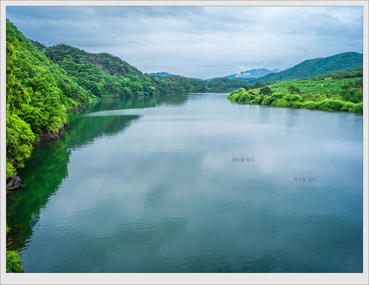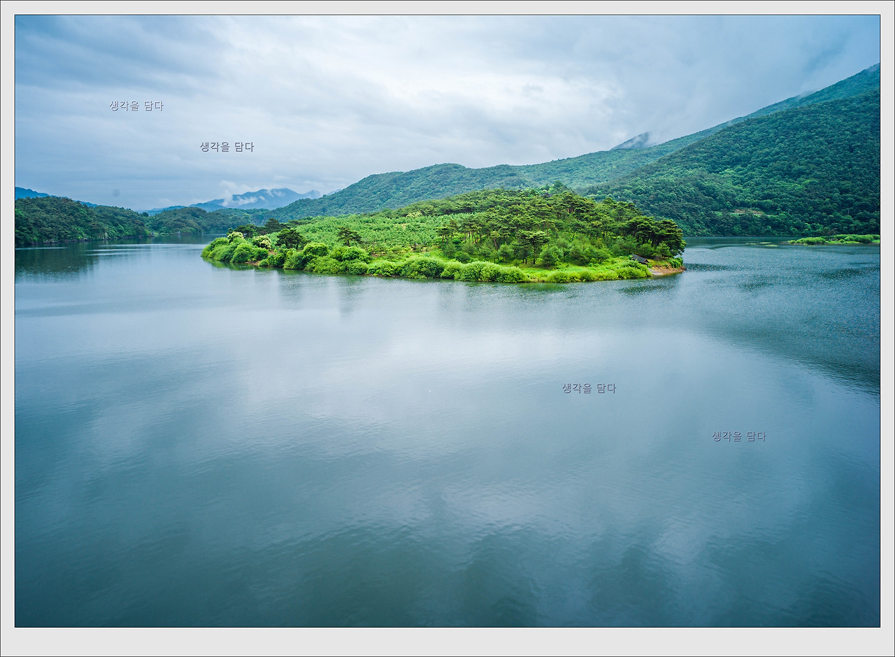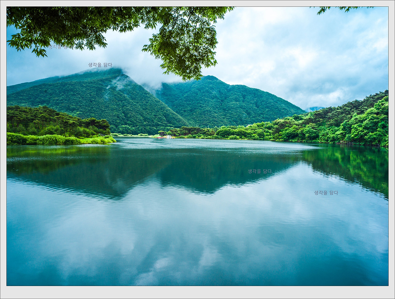 비 온 뒤의 호수 풍경이 마치 새벽 호수 풍경 같습니다.