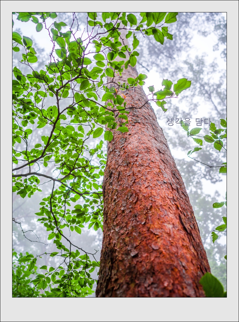 산 안개가 가득한 잡목 숲 속에 금강송 한그루가 아름다운 자태를 뽐내고 있다.