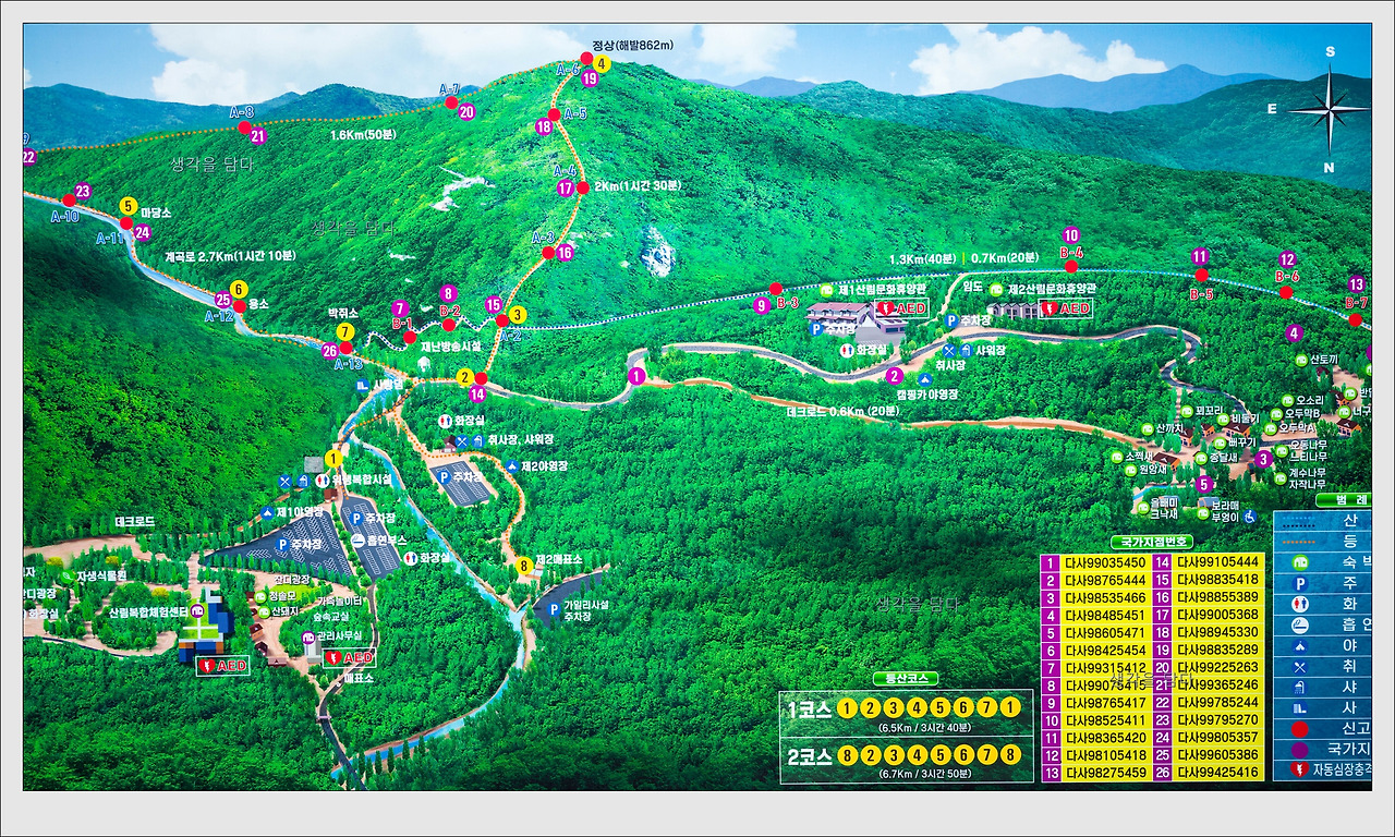 그러나 산행이 목적인 내게는 휴양림의 압도적인 규모와 편의 시설들이 모두 그림의 떡이다.