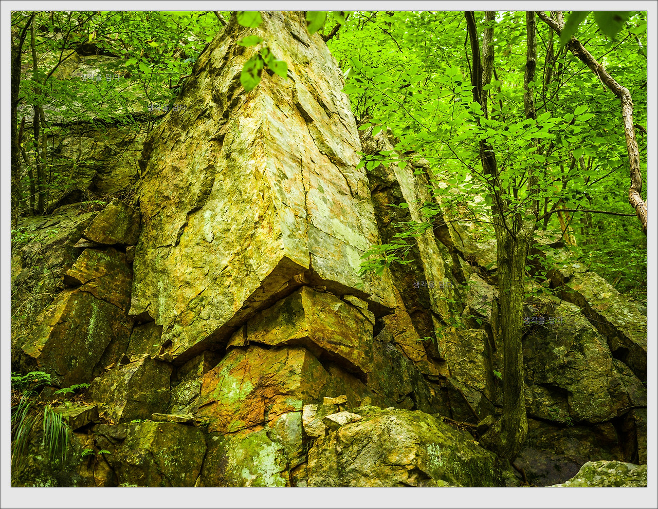 올라갈 때 대부분 육산이었던 능선길과는 완전한 대조를 이루고 있는 지형이다.