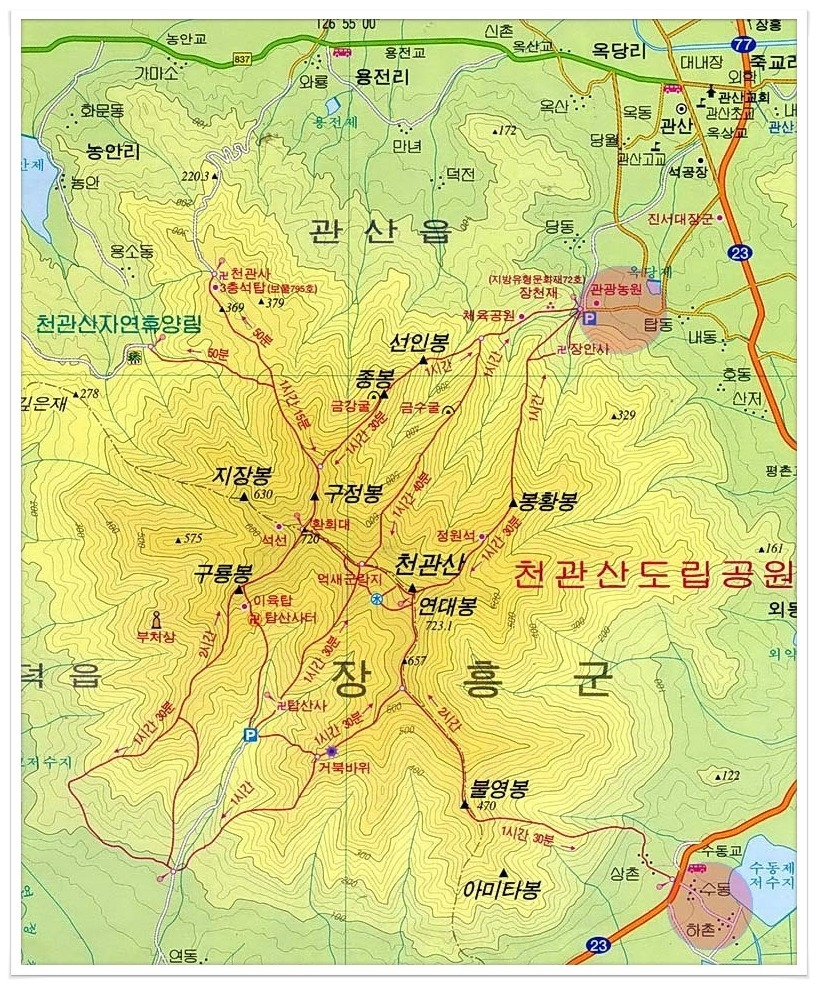 도립공원 주차장에서 오르는 천관산 등산코스는 양근암코스, 금수굴코스, 금강굴코스 등 3개의 코스가 있다.
