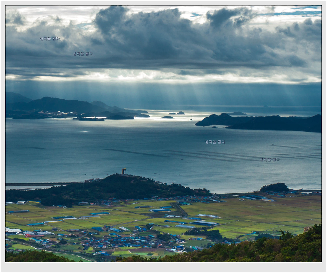 그리고 그 너머로 펼쳐진 다도해의 어느 섬들에 빛 내림 현상이 펼쳐지고 있다.