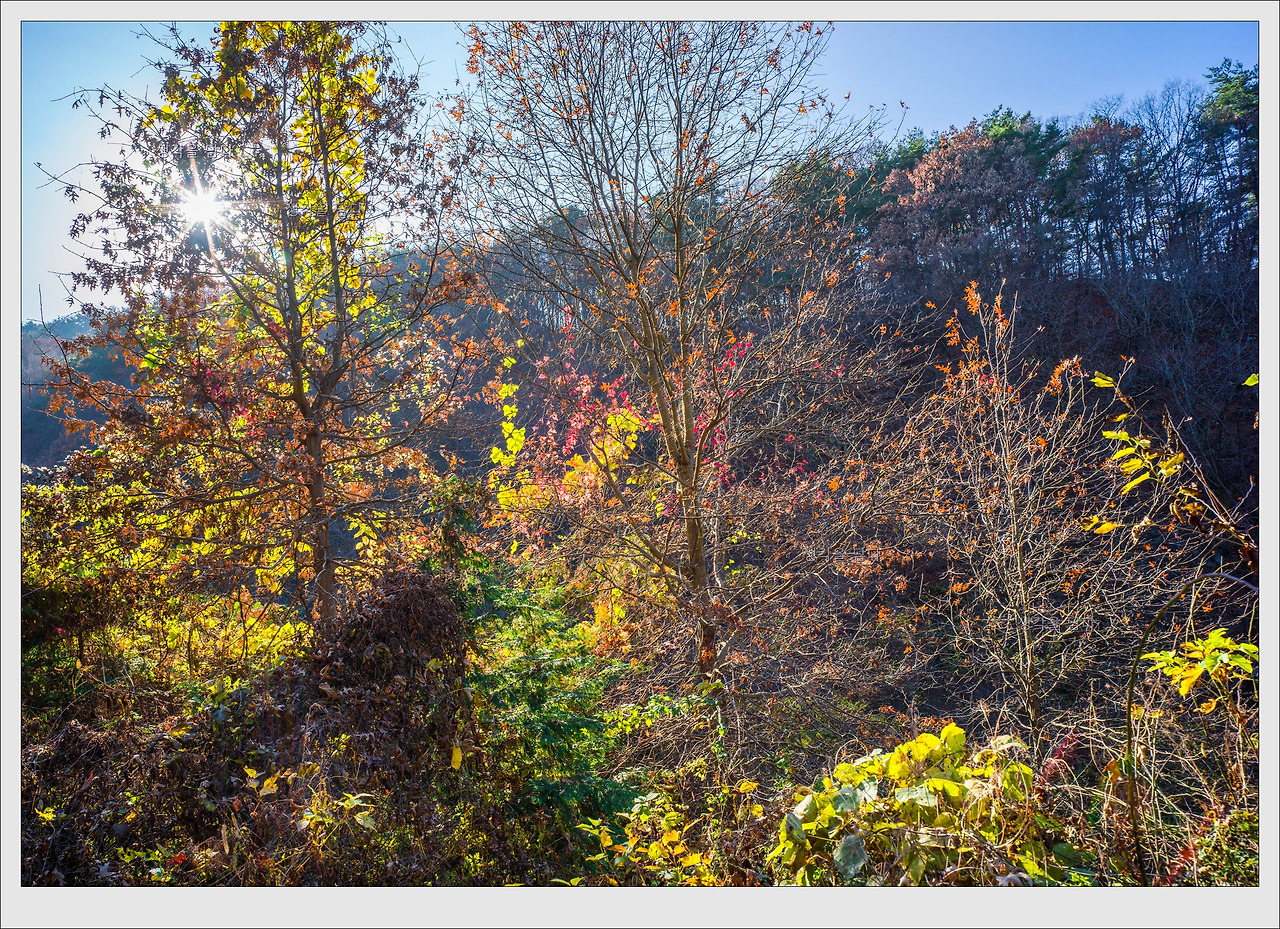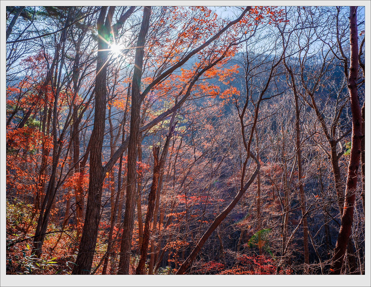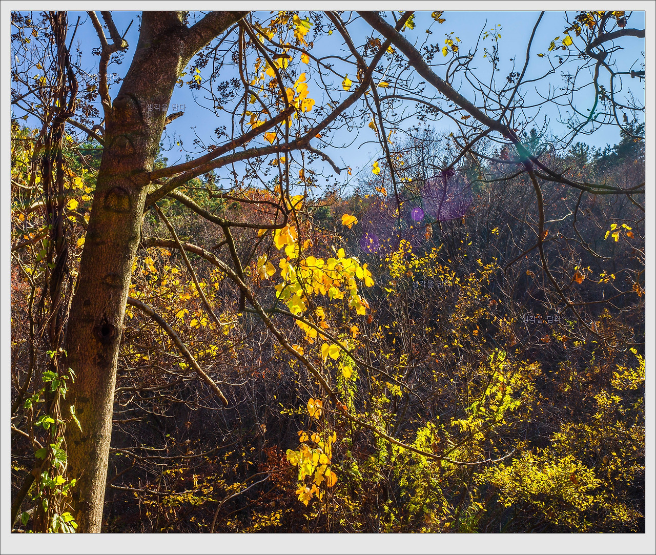 떨어지지 않고 나뭇가지에 그대로 말라 붙어있는 단풍잎이 햇볕에 반사되어 단풍처럼 아름답다.